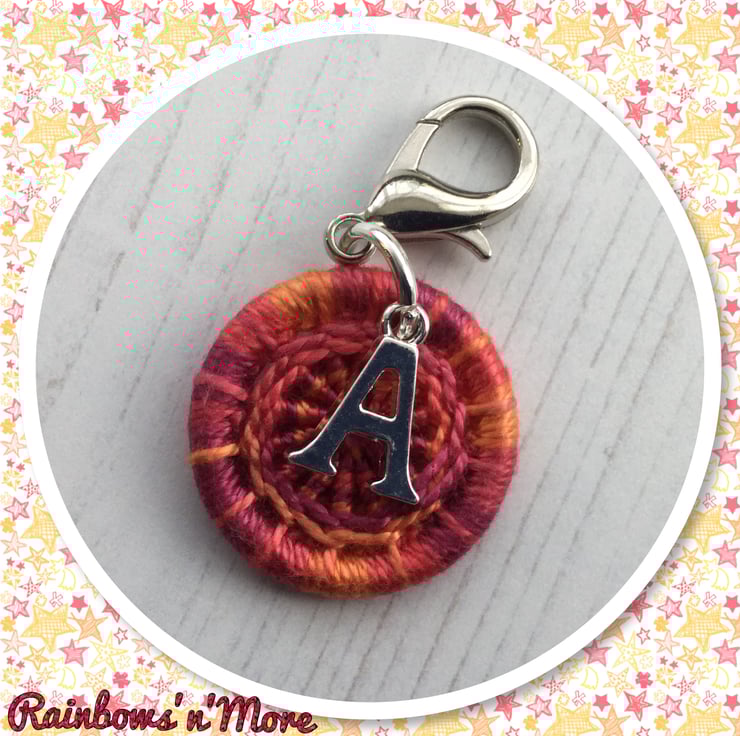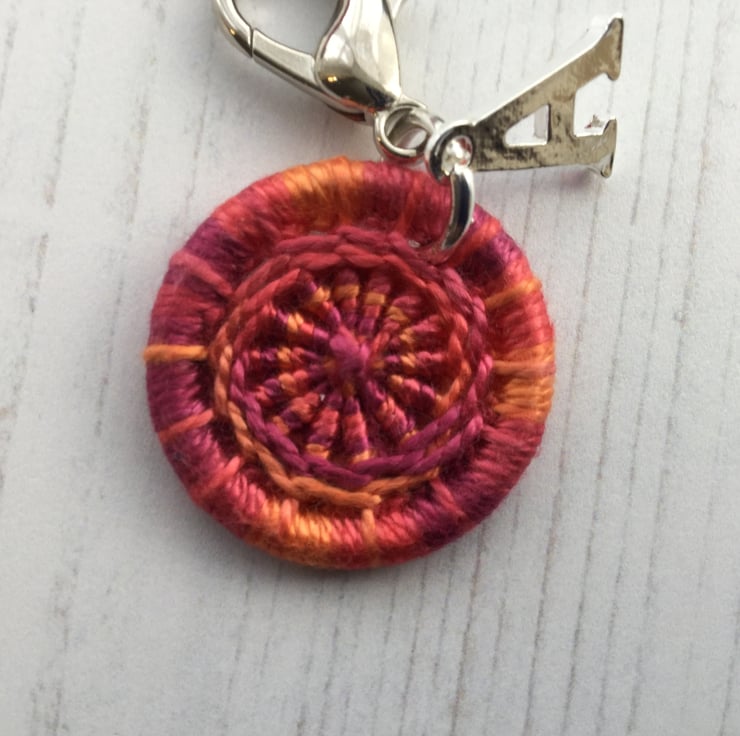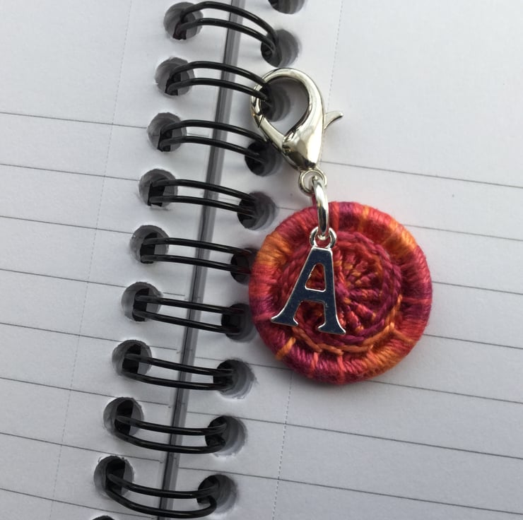 The button is hanging together with an initial letter charm from a lobster claw catch. This type of catch enables you to move your charm easily between bags, journals etc.