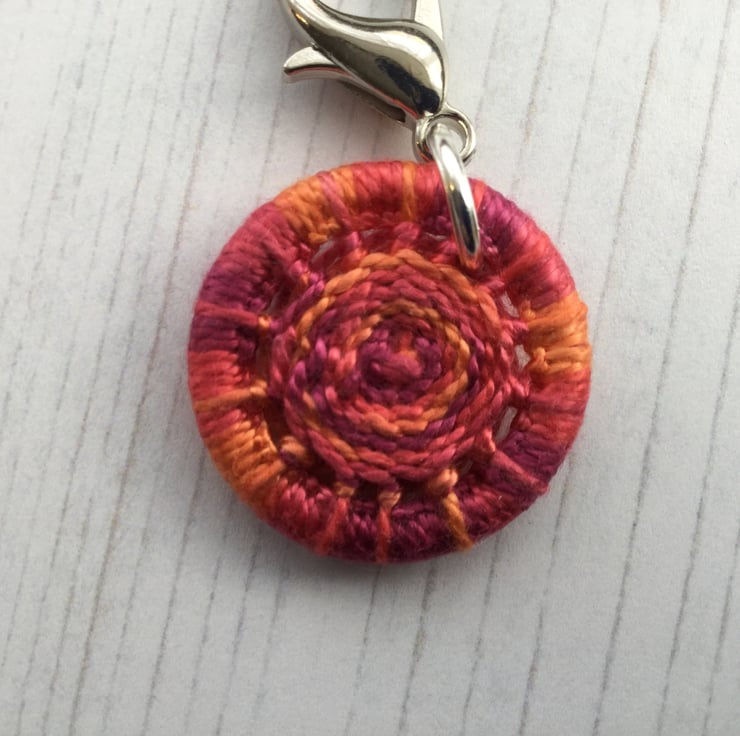 I have made this traditional Dorset Button using a colour changing pearl cotton thread in gorgeous hot shades on a 25mm brass ring, the finished button is slightly larger.