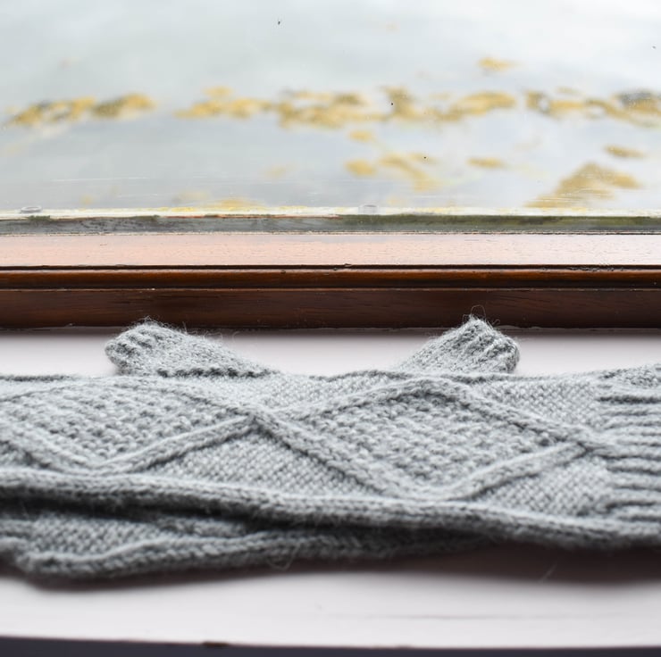 These longer length mittens are great for layering up. The diamond pattern is representative of the “drystane dykes” (dry stone walls), which divide fields all over the north east of Scotland. The Doric fingerless mittens are knitted in the round using the circular magic loop technique.