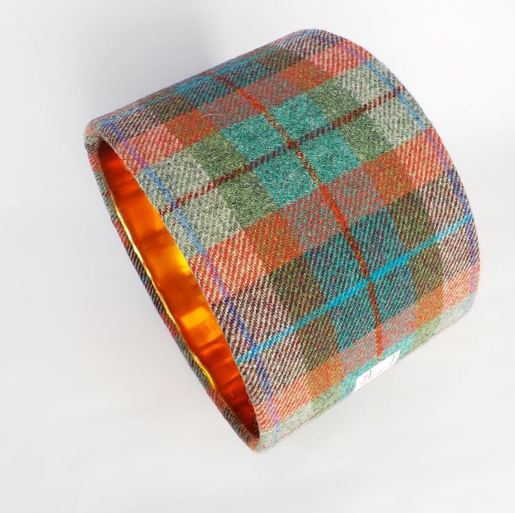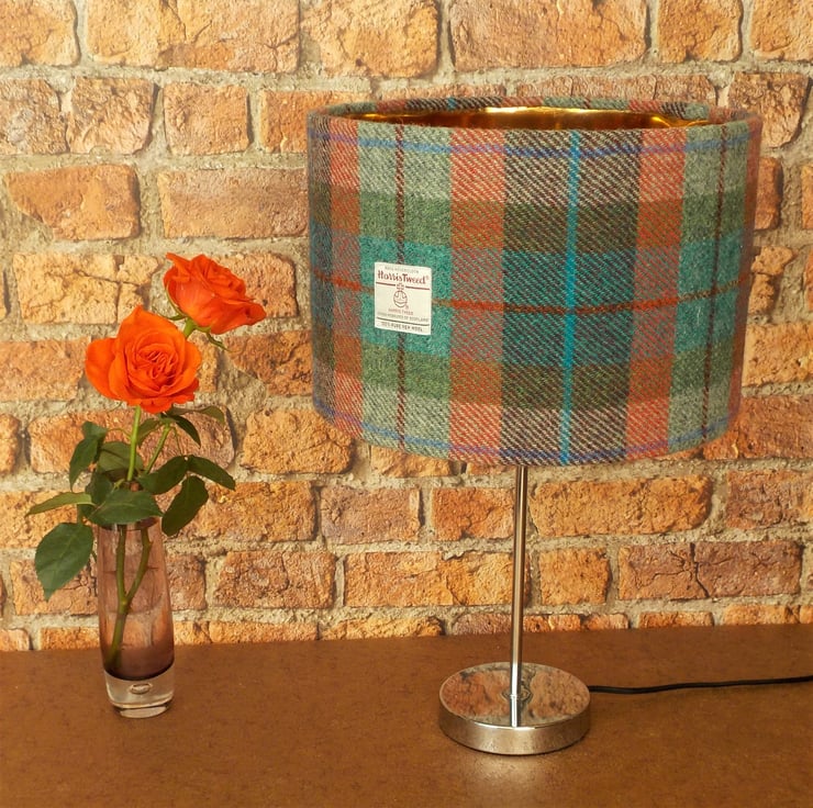 I have made this gorgeous lampshade from the world renowned Harris Tweed hand-woven wool fabric in a brick red and turquoise green design. The shade is a large simple drum shape, 30cm diameter, and 20cm tall.