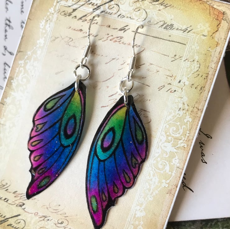 These brightly coloured fairy wings are so pretty and sparkle in the light because of the tiny pieces of iridescent glitter that have been sealed beneath the shiny surface of the wings.