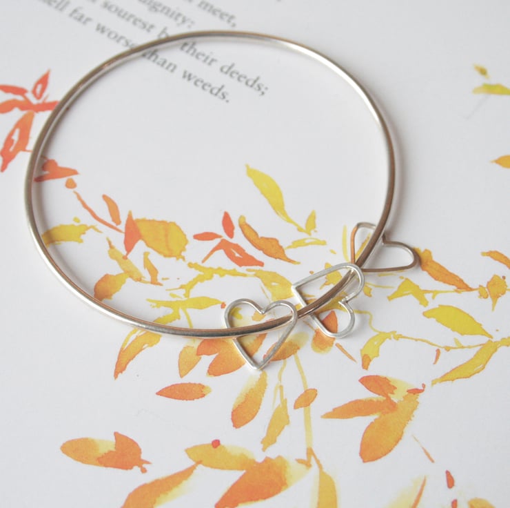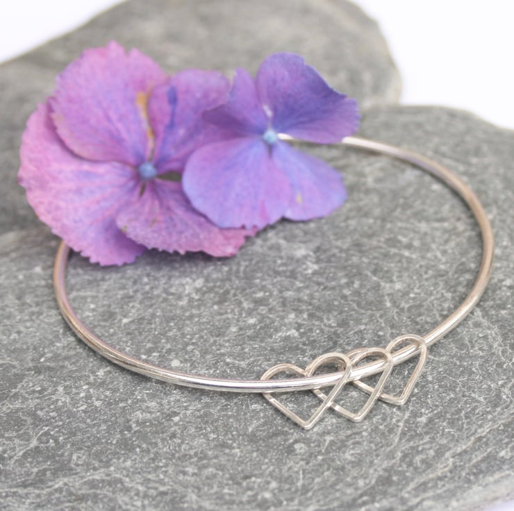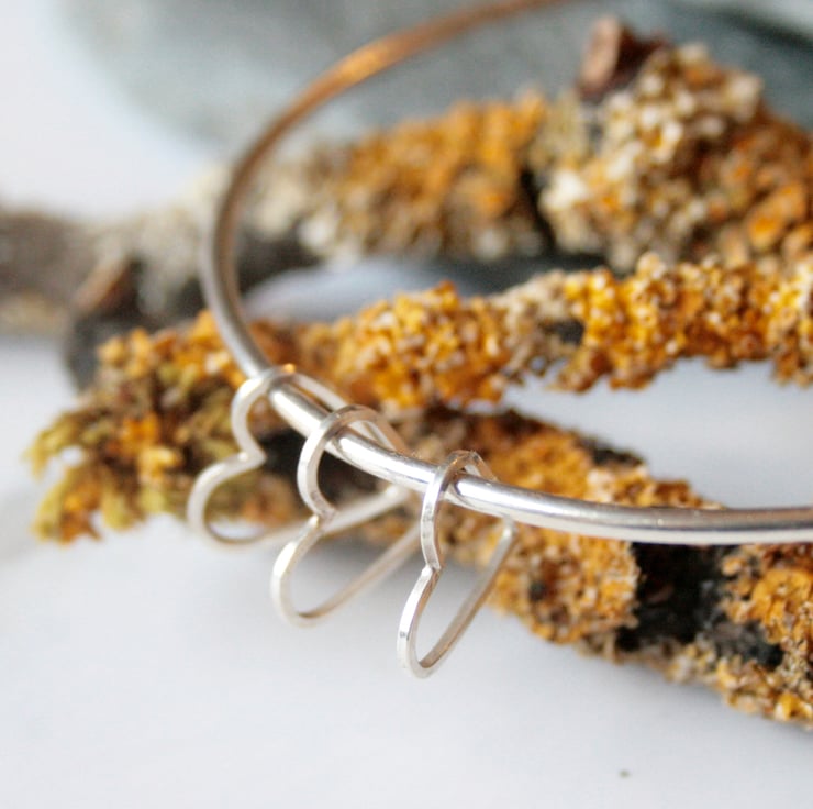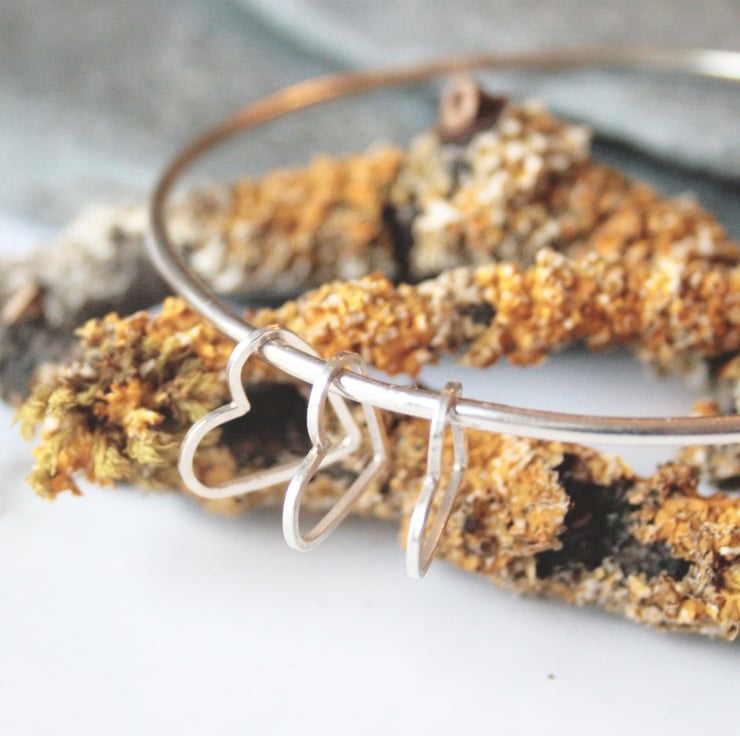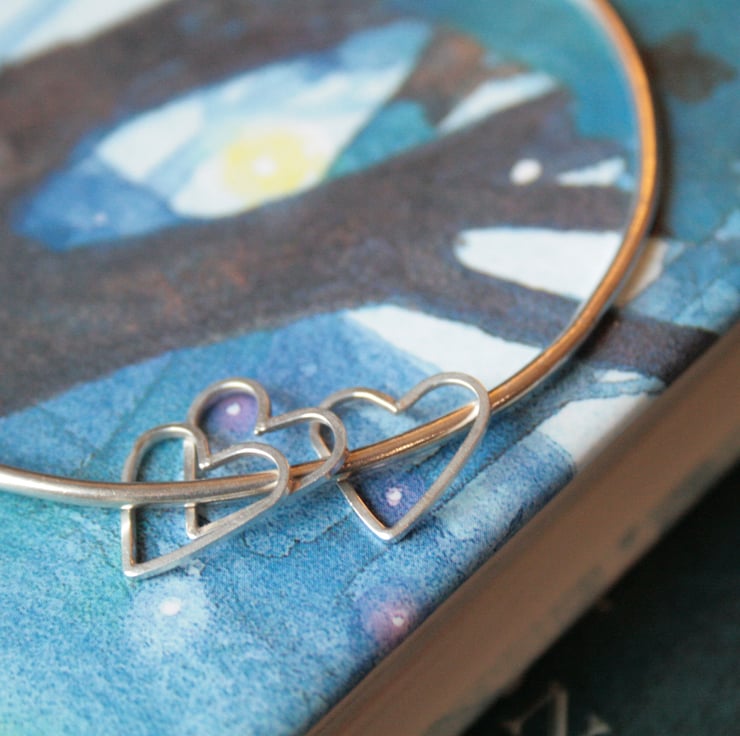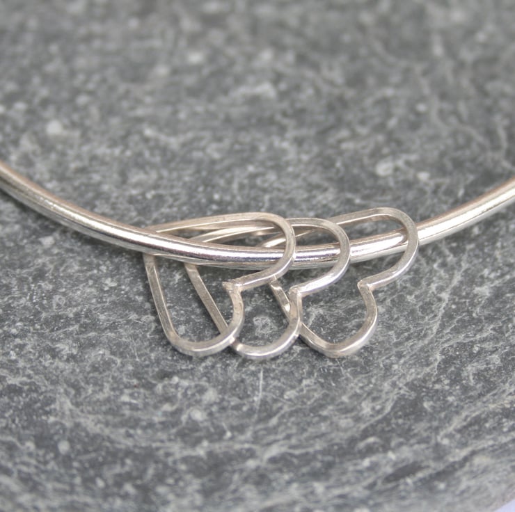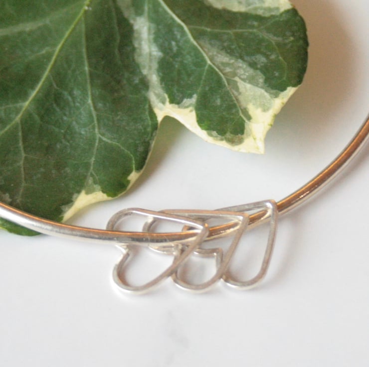The three hearts have been made from square wire and are free to move along the bangle. The width and height of the hearts is 13 mm. If you like additional hearts added please let me know and I can arrange that. A matching necklace is also available from Thistledown Wishes.