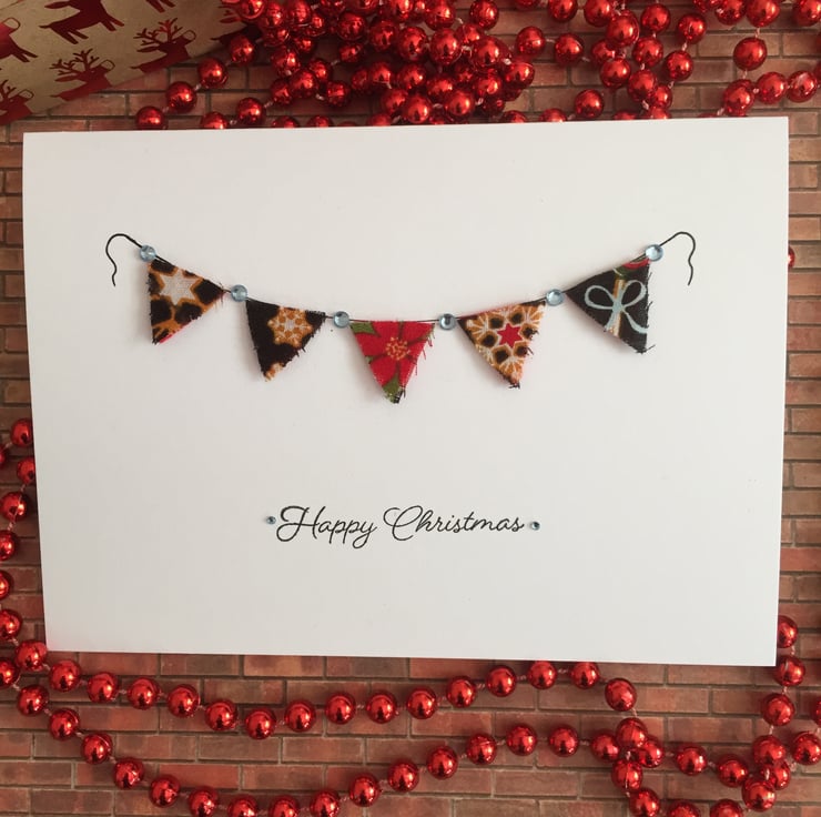 This pretty Christmas card, made from premium white card, has pretty fabric bunting which is hand cut from Christmas cotton fabric in black, red, green, yellow and pale blue with a red felt backing and finished off with pale blue adhesive gems, which all hang from a hand drawn binding.