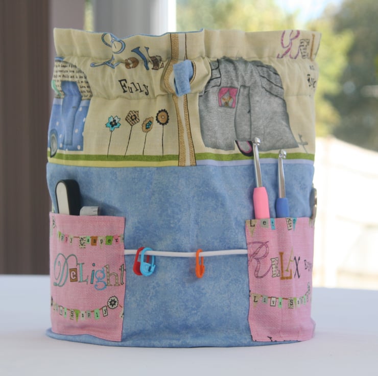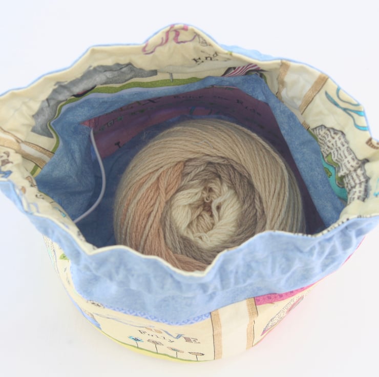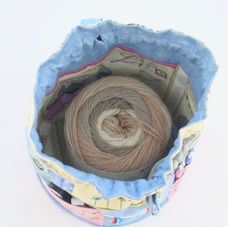 This drawstring bag, just the right size for a medium sized yarn cake or large ball of wool is perfect for keeping your yarn and tools all within easy reach. It has a drawstring closure which doubles up as handles to carry with you anywhere.