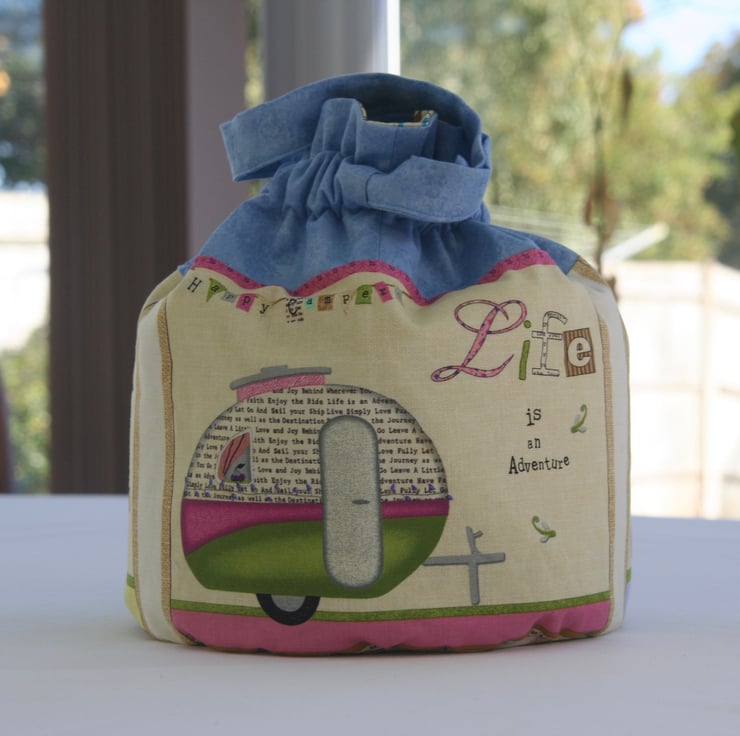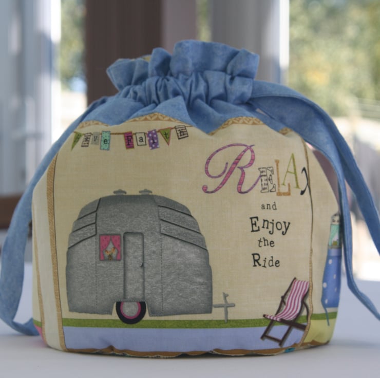 The bag is made using light blue spray time fabric and 'happy camper' patterned fabric with caravans and the mottos 'Life is an Adventure', 'Relax enjoy the Ride' and 'Delight in the Journey', on a beige background for the main bag and a pink background for the pockets.