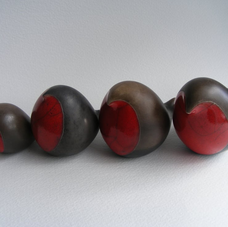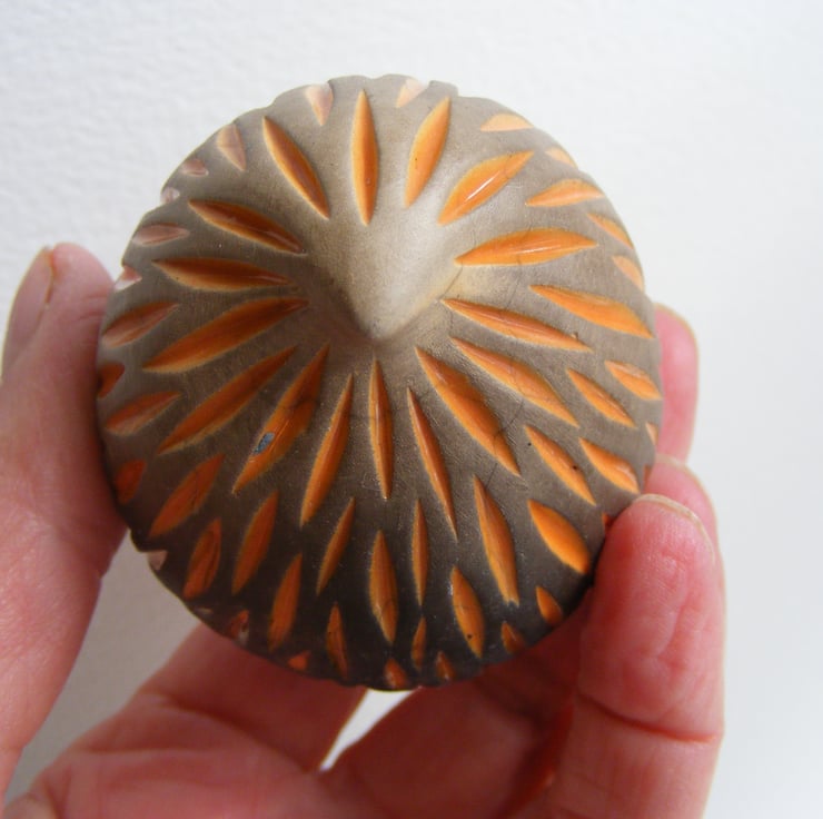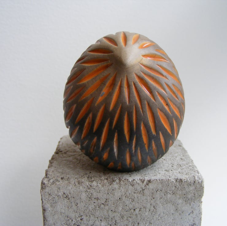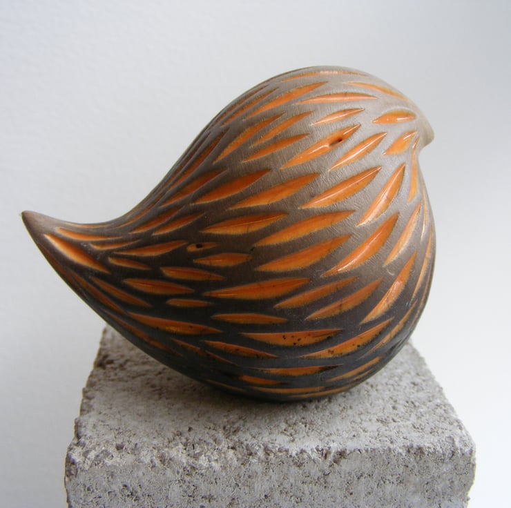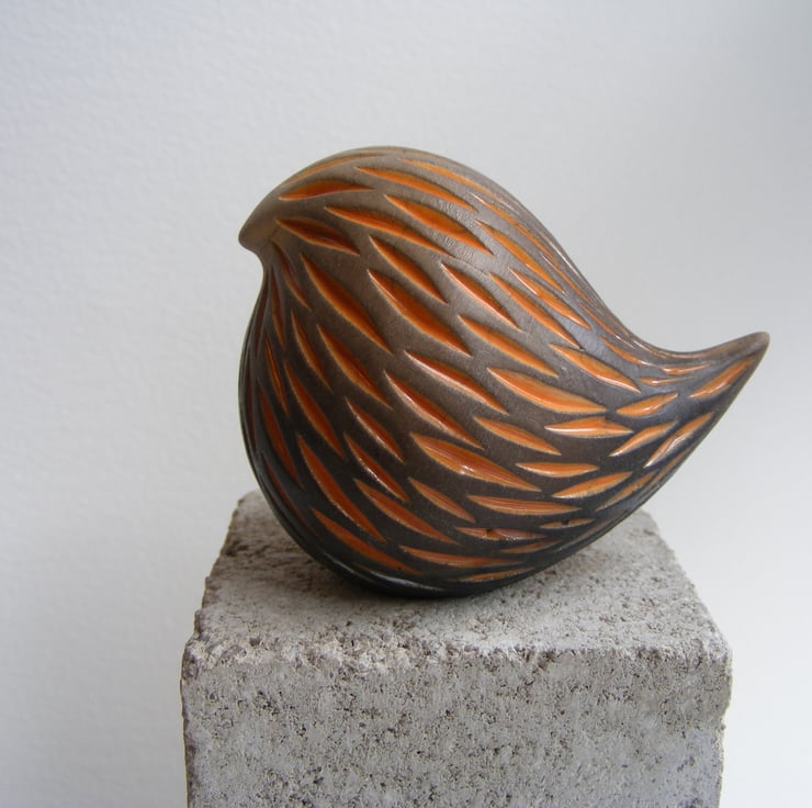 This bird is hand made and measures, 5cm high and 5.5cm long. It is made from white earthenware clay and carved before being fired in an electric kiln, it is then covered in orange raku glaze which when dry is wiped back leaving the glaze in the carved indents, it is then raku fired in a gas kiln, the black part of the bird has been sanded and is unglazed and polished with beeswax. (Last photo shows comparison sizes of small birds)