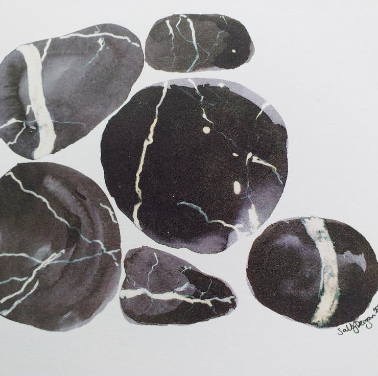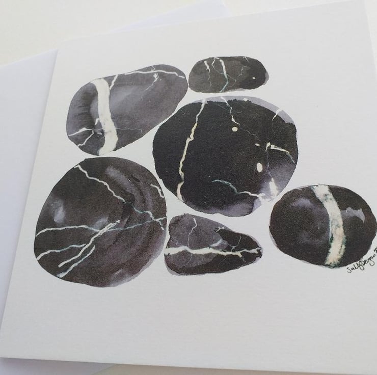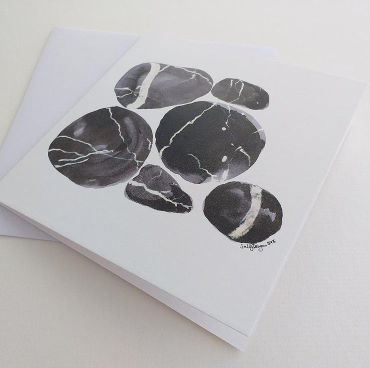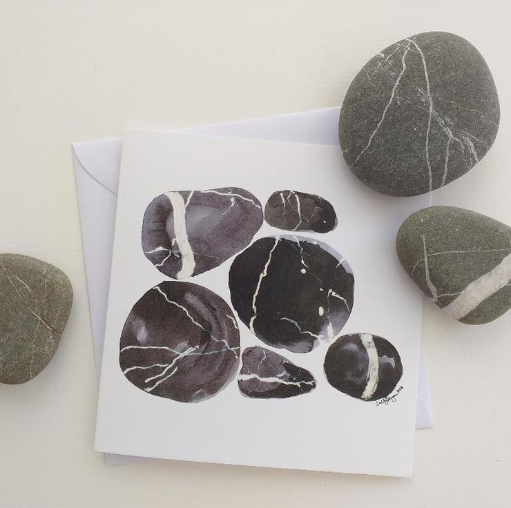 Professionally printed card size 15cm by 15cm of my painting of pebbles using ink and bleach. The pebbles are slate veined with quartz and can be found all round the British coastline. I love the different patterns in them.