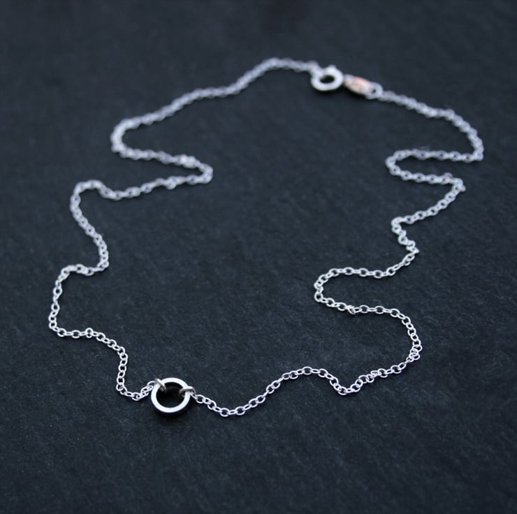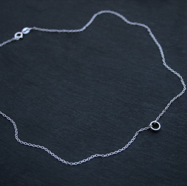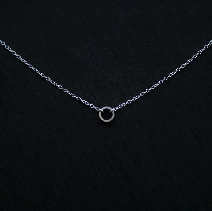 This elegant sterling silver necklace has been handmade using 925 sterling silver tube and fine trace chain. The small circle is connected on both sides allowing the pendant to sit beautifully on the chest.