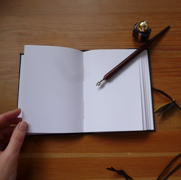 An A6, hand bound leather blank book, great for using as a notebook, journal, bullet journal or travel journal.