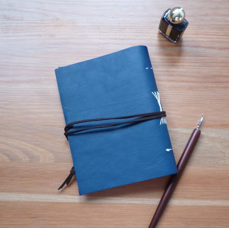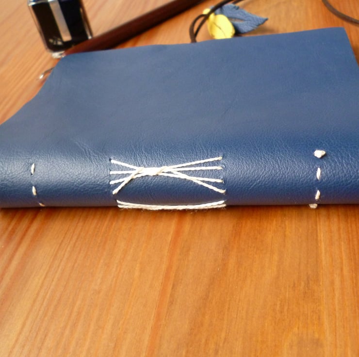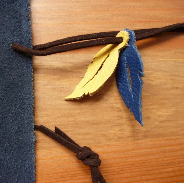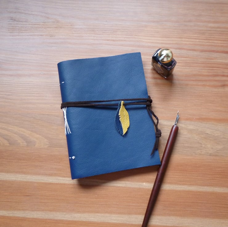 It features a cover made from blue upcycled leather, which has been hand stitched together with contrasting sturdy white waxed thread. A dark brown, faux-suede tie comes around the front, tucking into itself to keep the book closed - this is decorated with a couple of hand-cut leather feathers.