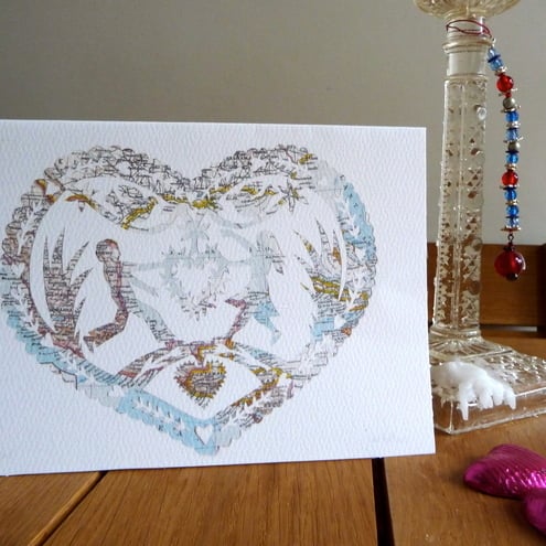 This is a lovely print of an original design by myself of a papercut that I did on old vintage maps. It is printed on white cards which has a slight texture.