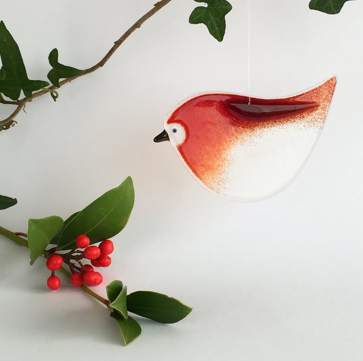 This listing is for one medium fused glass robin. This bird comes on a length of invisible thread is presented in a red pouch.