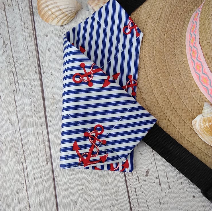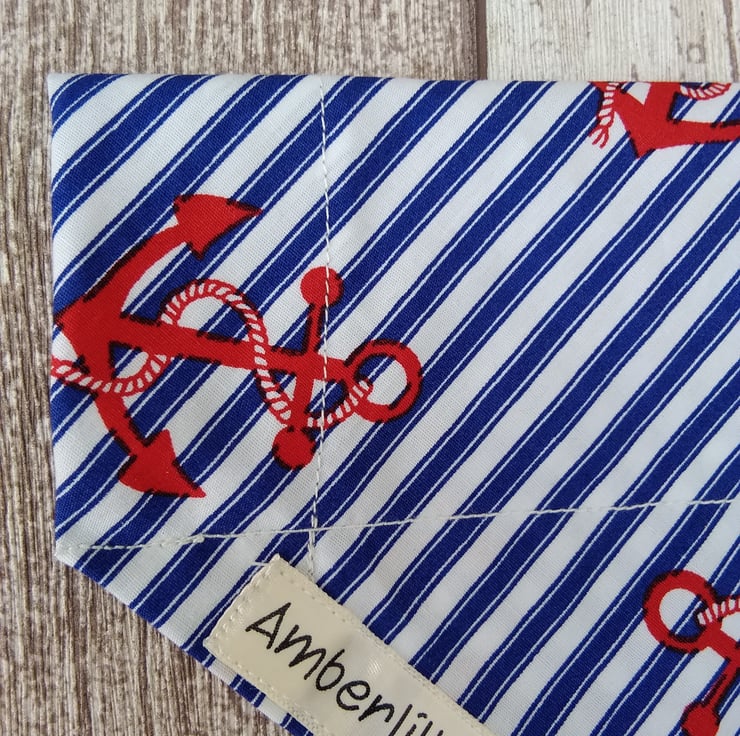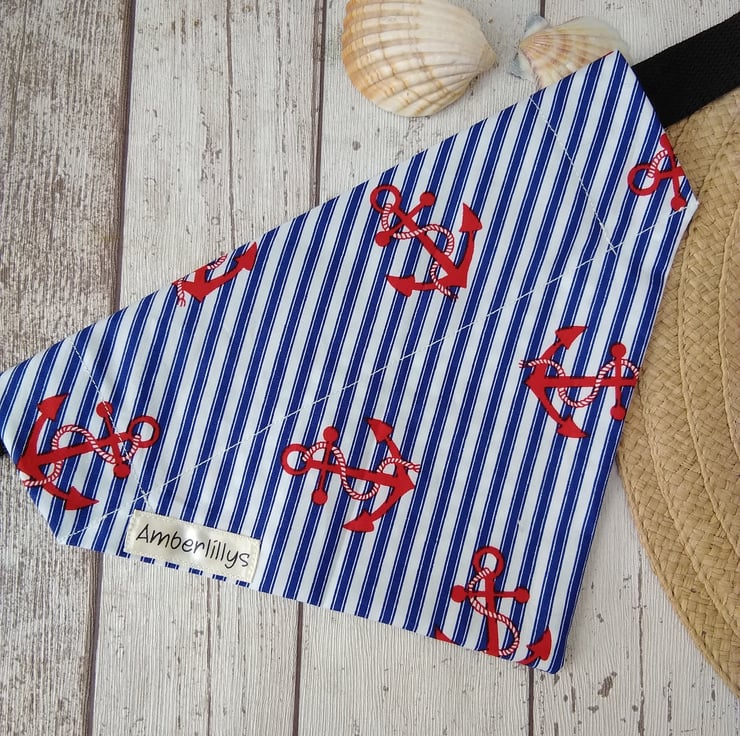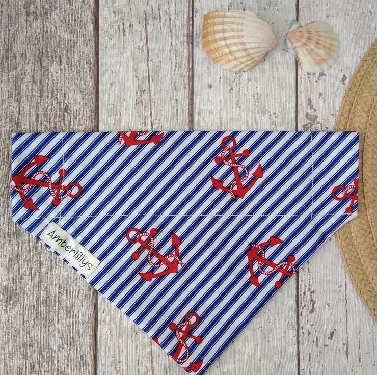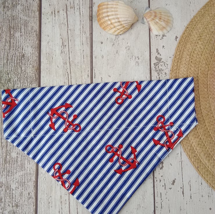 A fun Nautical over the collar style dog bandana scarf in cotton. Perfect as a gift for the coming season. Suitable for a medium to large dog. Easy to slip collar through. Double sided.