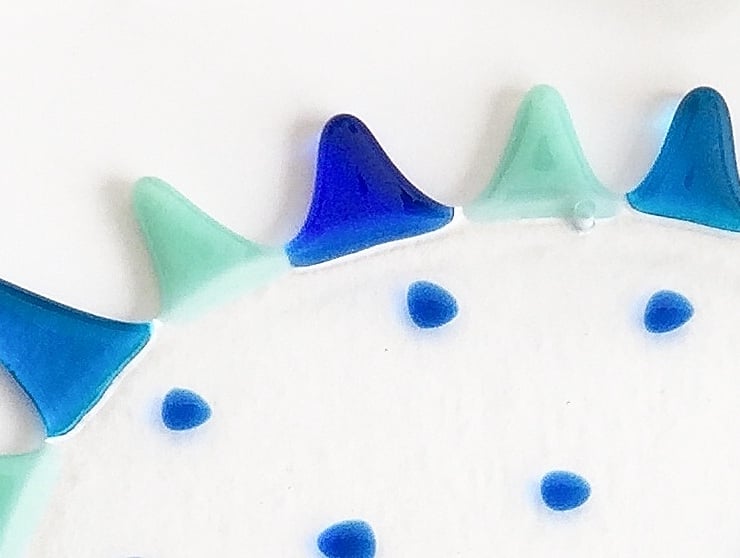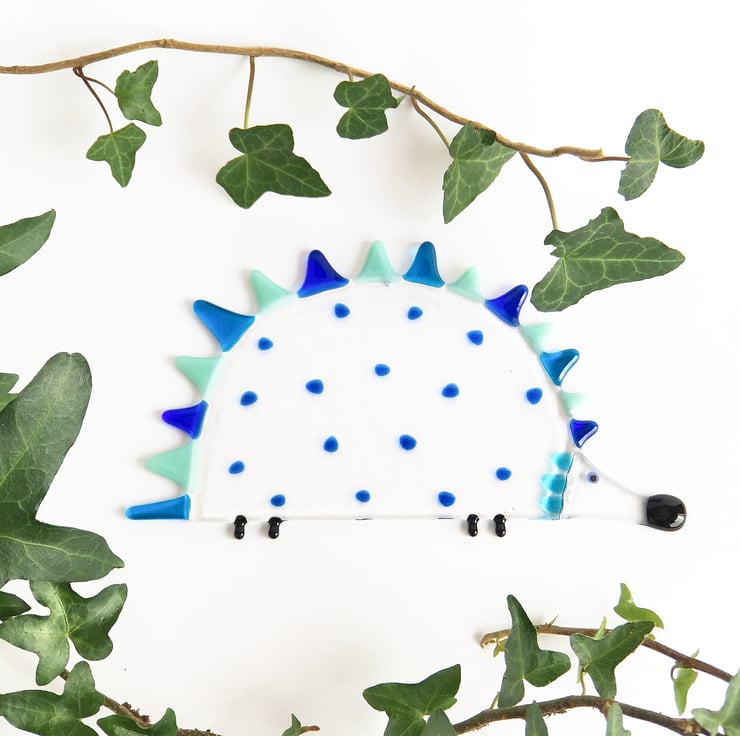 this is a wall mounted or hanging decorative fused glass hedgehog with turquoise, blue and duck egg blue spikes. It would look beautiful hung in a window or nailed to the wall in a bedroom or any other area of the home. It measures 18cm x 13cm.