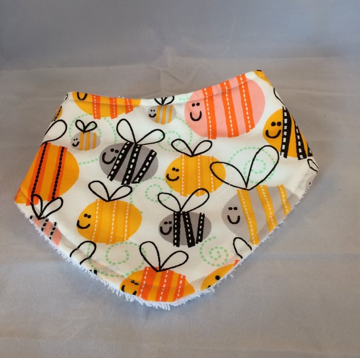 Pack of 2 Dribble bibs one bumble bee print and the other in a beige and white polka dot snap fastener closure, the back is a thick terry toweling making then very absorbant and will help keep your little one dry.