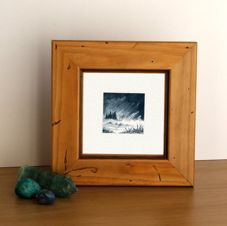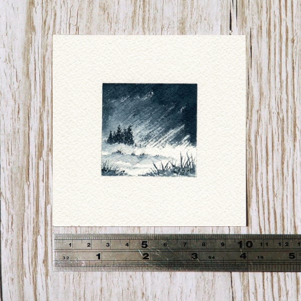 This listing is for one unframed, original miniature watercolour painting of a snow storm in the Scottish landscape. Blasting winds and snow buffet a small group of trees and grasses - you can practically feel the chill. It is not a printed reproduction. The image is 2 inches square (5x5cm) painted on a 4x4 inch (10x10cm) piece of quality cotton rag watercolour paper with artist quality paints. Signed, unmounted and unframed. Each painting is well packaged in protective folders to keep your purchase clean.