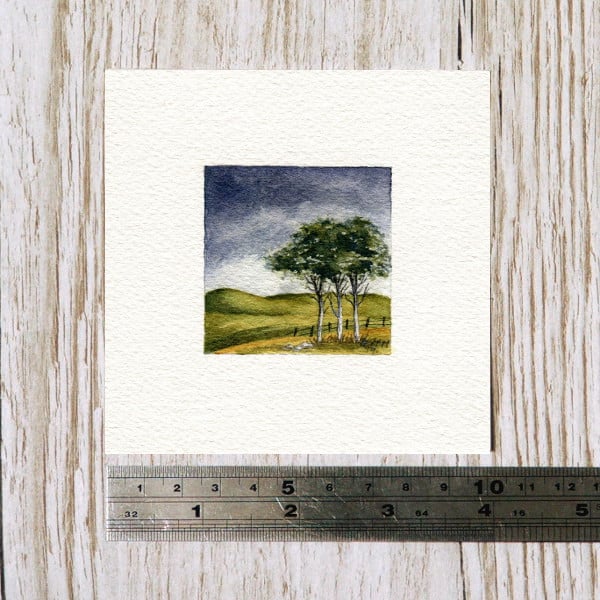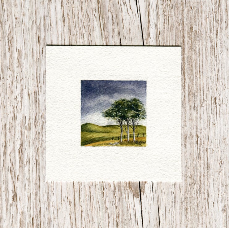 This listing is for one original miniature watercolour painting of a group of pine trees in the Scottish Borders, windswept by many years of stormy weather. It is not a printed reproduction. The image is 2 inches square (5x5cm) painted on a 4x4 inch (10x10cm) piece of quality cotton rag watercolour paper with artist quality paints. Signed, unmounted and unframed. Paintings are well packaged in protective folders to keep your purchase clean.