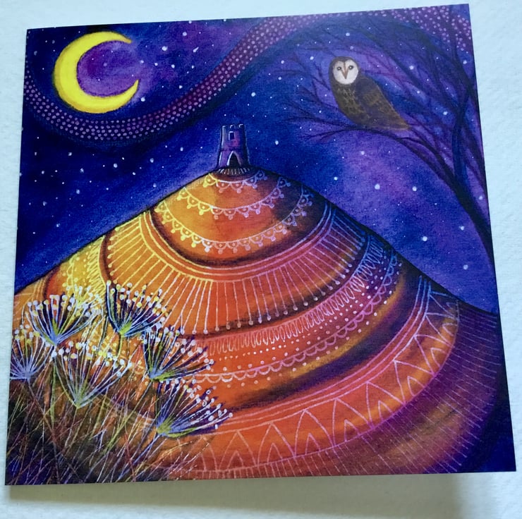 This card has been printed from an original painting that I did, featuring a barn owl under a crescent moon and starry sky overlooking Glastonbury Tor. It is a blank greetings card making it suitable for a variety of occasions. It measures 14.5x14.5 cm and comes with an envelope