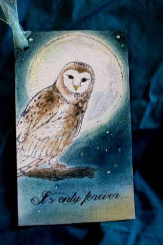 and part of the famous quote "It's only forever, not long at all". Each tag is die-cut from 300gsm card, stamped, hand painted, given a soft vintage aged look by hand, embellished with glitter and then finished with a tie of blue organza ribbon. If you would prefer a different ribbon or tie just let me know and I'll see what I can do.