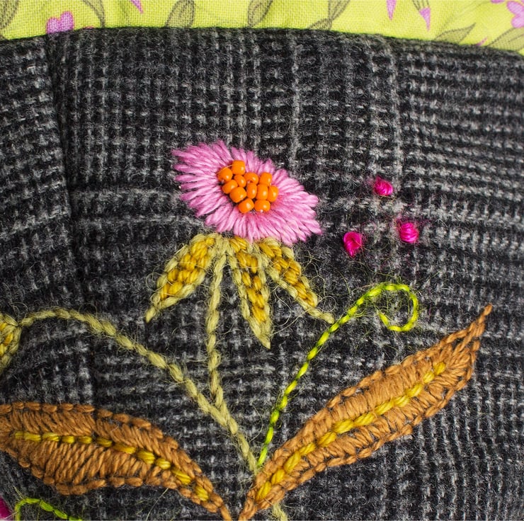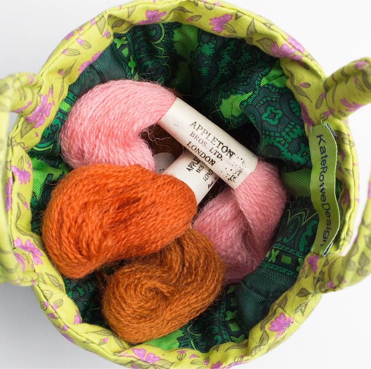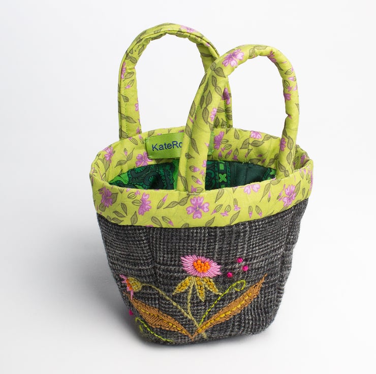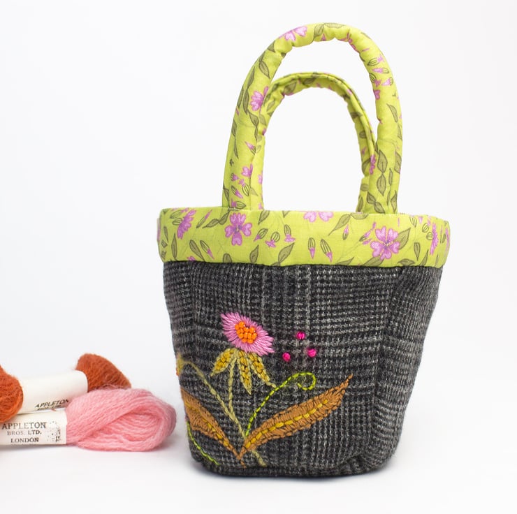 This is a very small project bag for little tiny items that you want to keep together and find easily as you work. It is made from Prince of Wales check suiting and lined with an up cycled scarf print and trimmed with my green campion print on cotton. I have hand embroidered a pink flower and leaves onto the outer. The bag is bucket shaped to help you find your items quickly. The depth of the bag is 10.5cms(4 inches) and the base measures 7cms square (2.5 inches square)