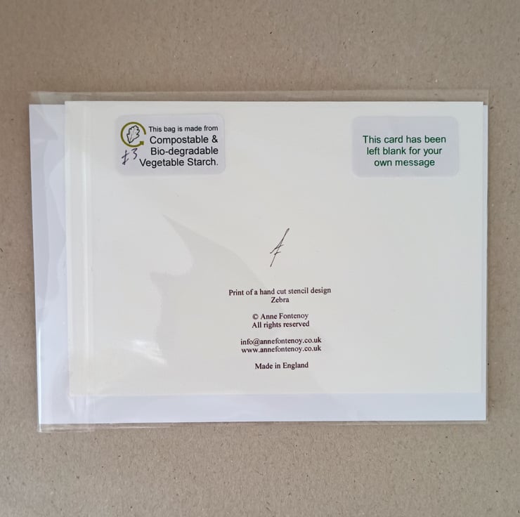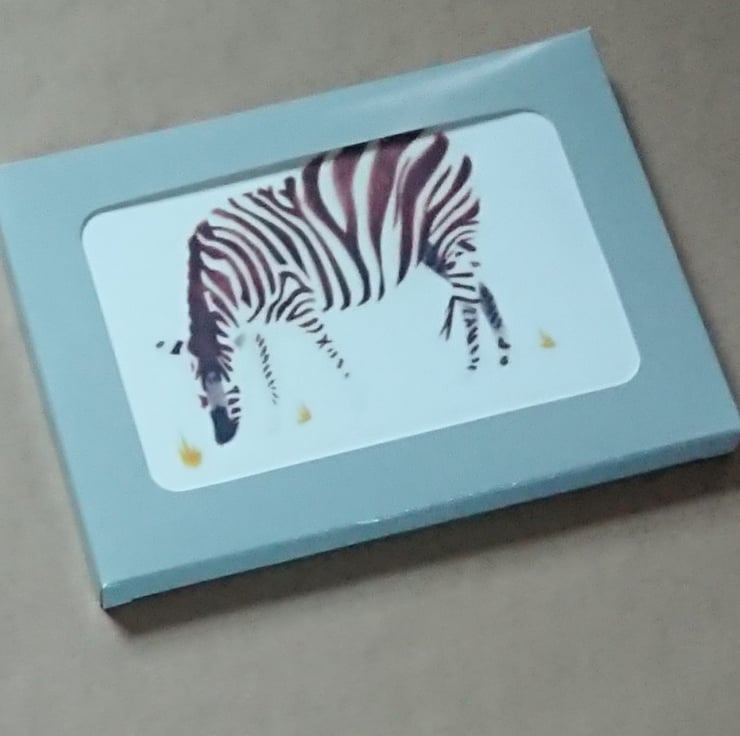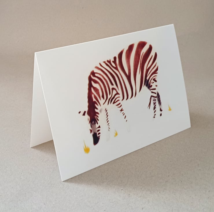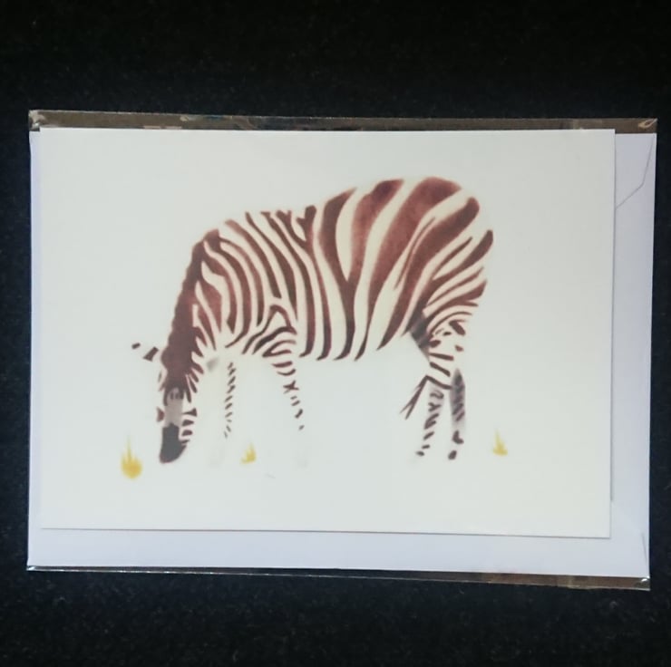 Zebra - a handmade card. I made the original artwork from hand cut stencils based on drawings I had made of a photo of a zebra that someone had given me to make a card design from. I airbrushed the design onto fine art laid paper and I have scanned the original stencilled design. I print these cards with Epson Claria inks with a desktop inkjet printer onto a 190 gsm digital fine art English watercolour paper.