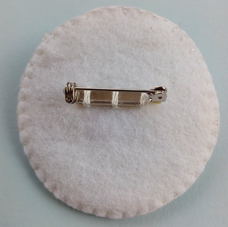 A contrasting mix of red, blue and beige felt pieces have been used against a white circular background to make him really stand out. He will add a little bit of fun and cuteness to any outfit, coat, jacket or bag.