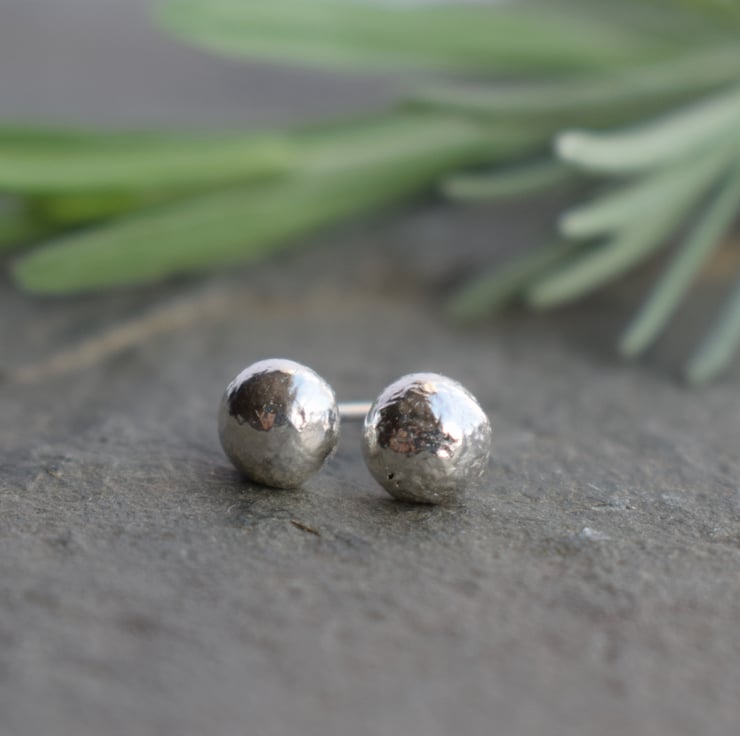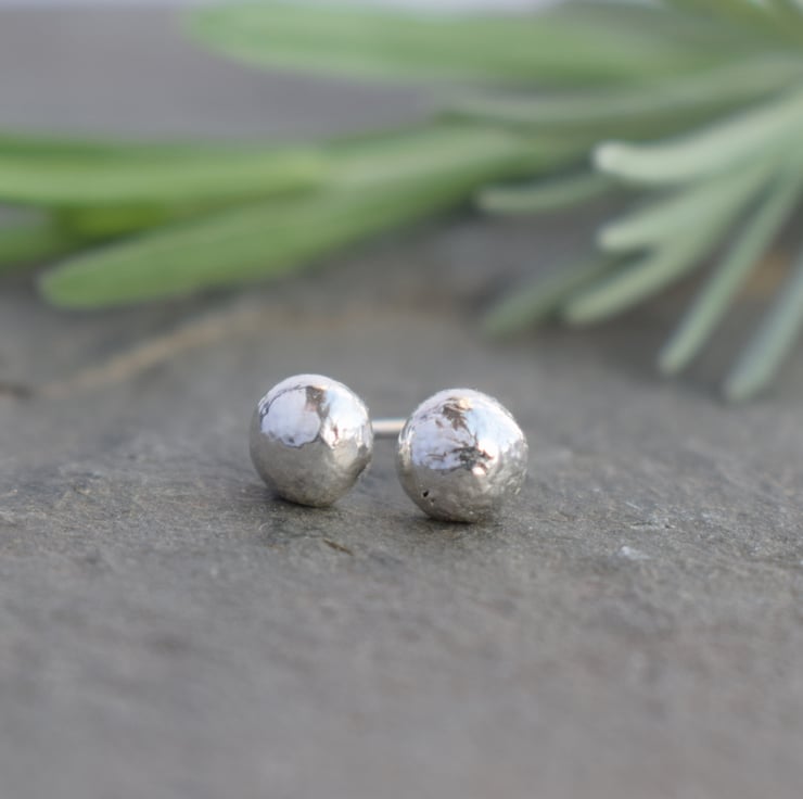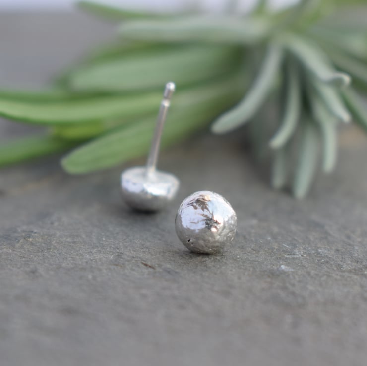 Beautifully rustic silver stud earrings, handmade using sterling silver reclaimed from waste offcuts in the jewellery making process. The process of melting down the silver creates this beautifully organic rippled effect on the surface of the metal, meaning each pair is truly unique. A minimalist style perfect for everyday wear.