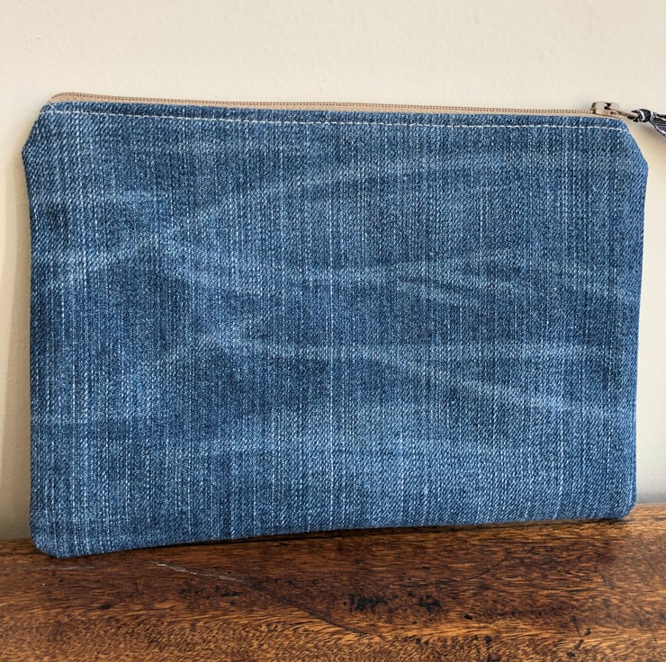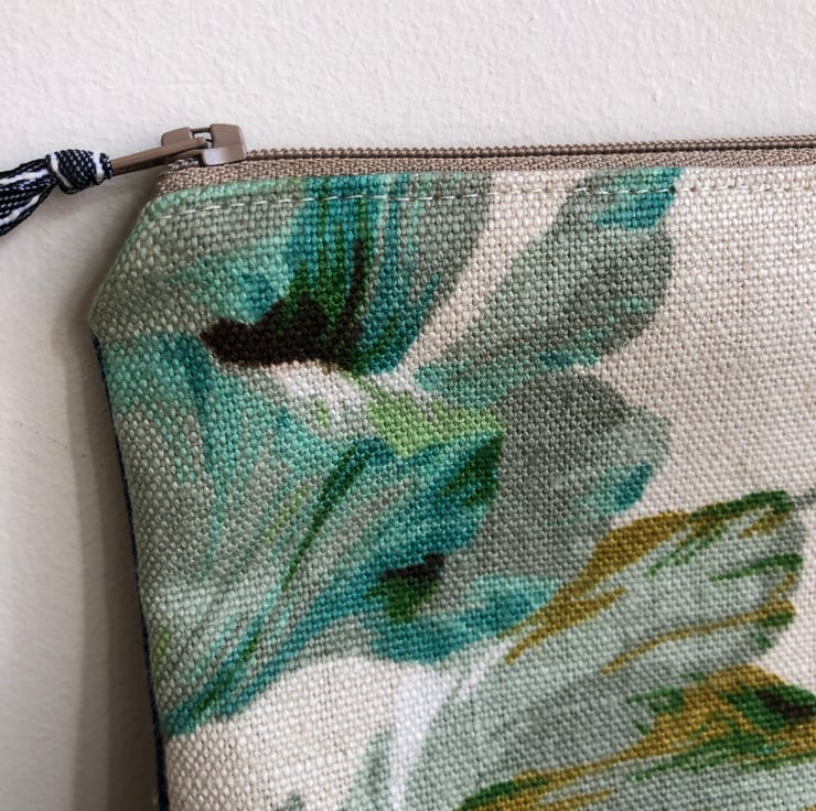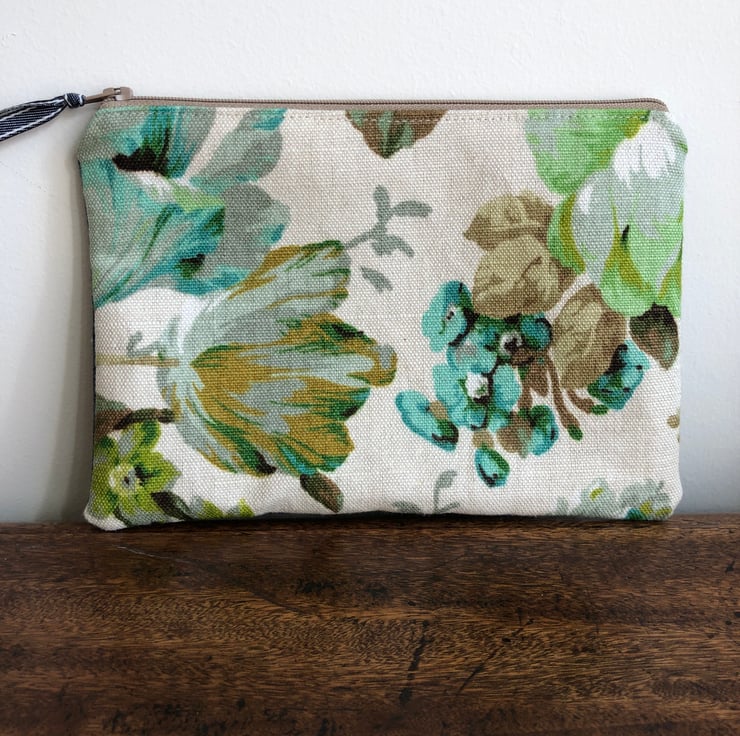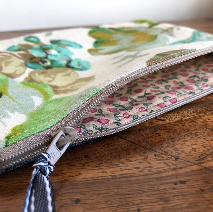 Handy zip pouch in thick vintage Sanderson Linen in really unusual shades of green. The pouch is neatly backed with recycled denim and fully lined with a pretty floral cotton, so there are no raw edges.