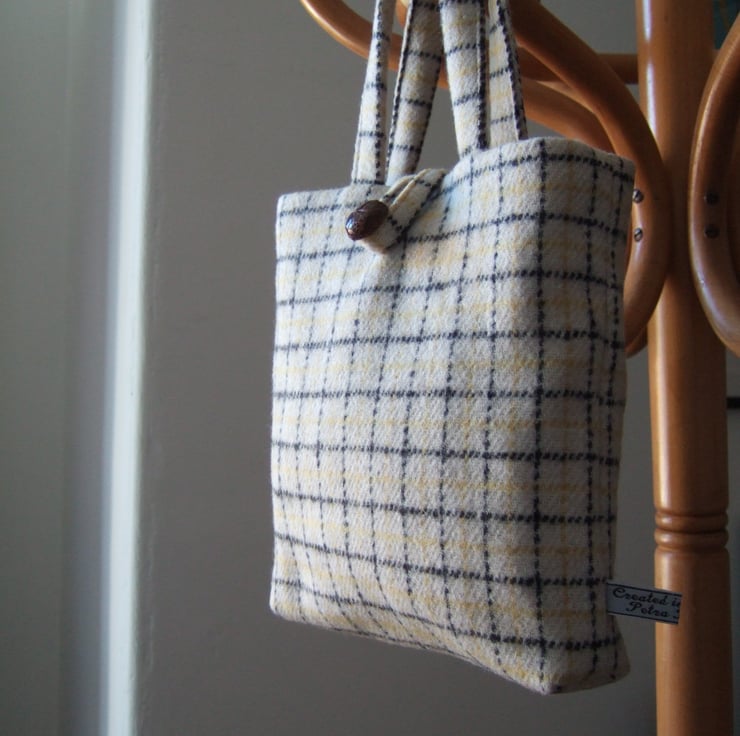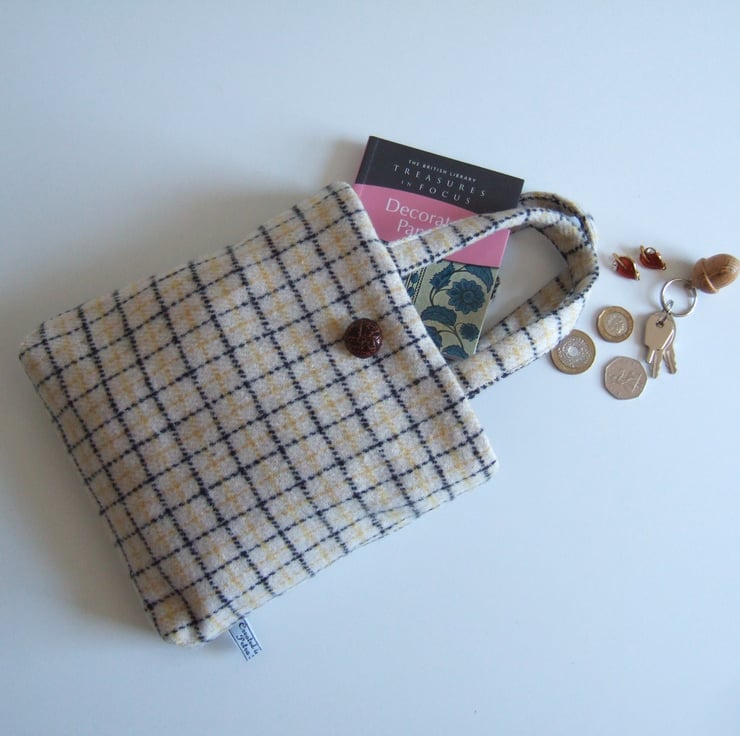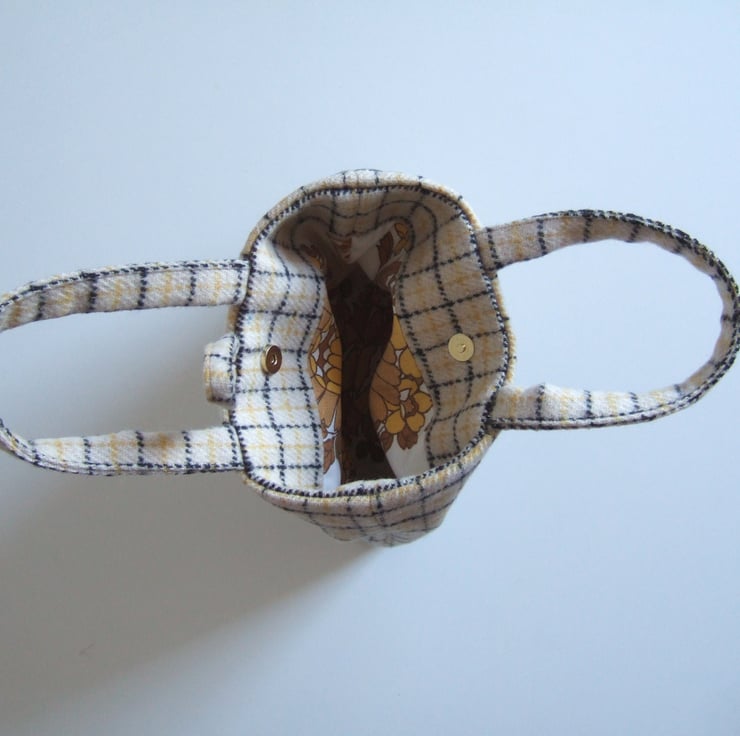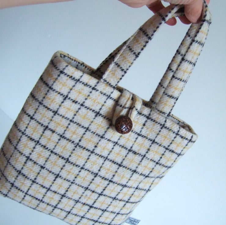 This sweet little bucket bag is made from an understated cream, black and gold checked wool which has a soft brushed finish to the surface. It has a lovely old leather button and loop fastening, as well as a magnetic snap, and has two handles long enough to fit snugly around your hands. This dinky little bag is just large enough to hold your small essentials, or for storing precious mementoes or souvenirs. It would make a great present for Mum.