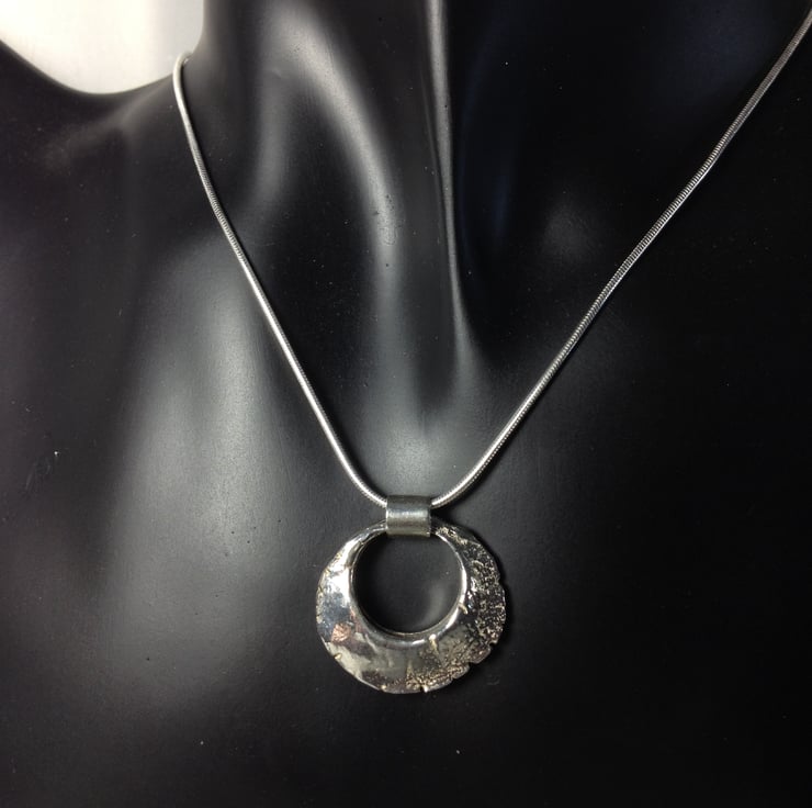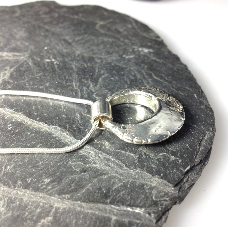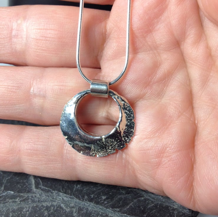 I have sculpted this solid ring pendant then cast it in sterling silver, it has a lovely weight and a weathered aged appearance, it measures just over 2 cm diameter and is over 4mm thick in the centre, tapering to the outer edges.
