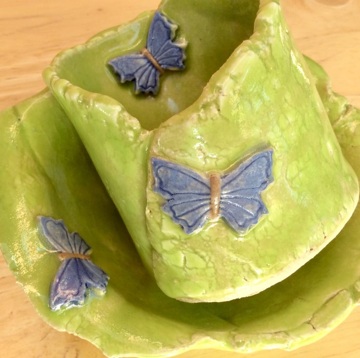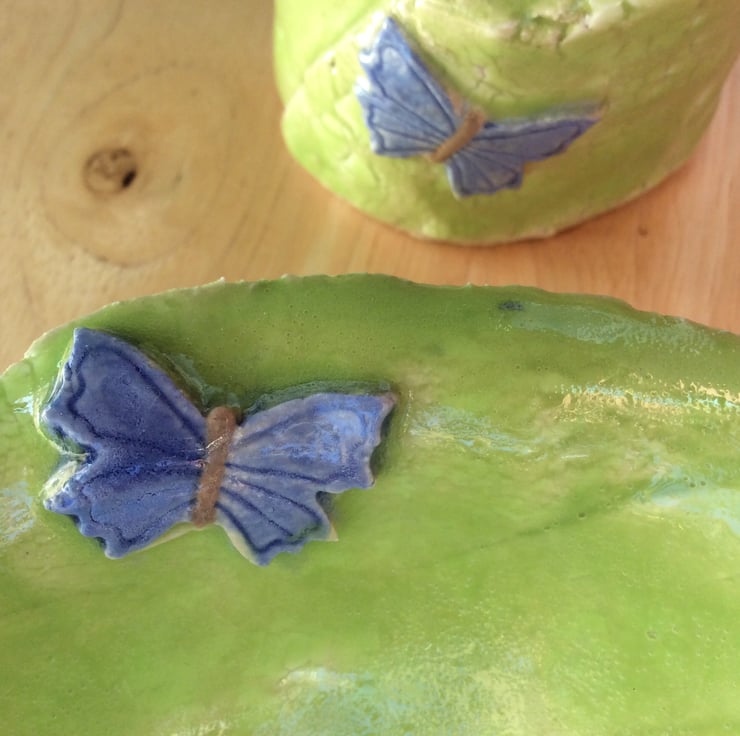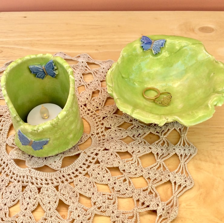 A cute lime green ceramic ring holder and tea light holder set with periwinkle purple butterflies. 2 on the tealight holder and 1 on the dish. The dish also has 3 purple feet.