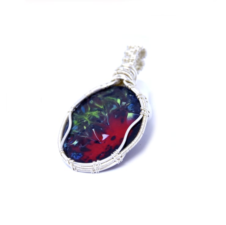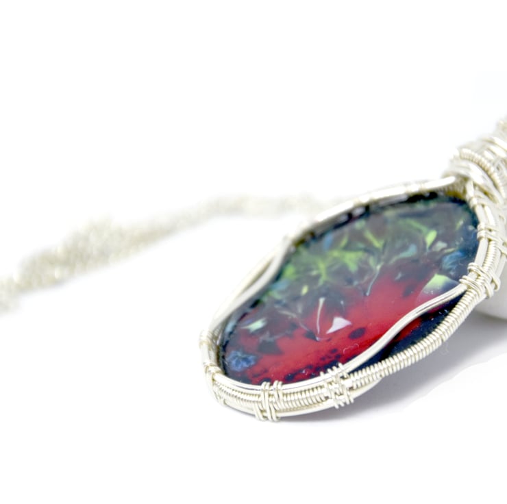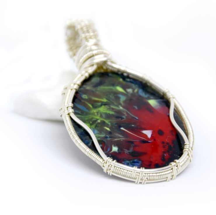 This enamel cabochon was made during a workshop; when i was trying out different arts and crafts techniques; the wire wrapping around the cabochon was made in such a way as to showcase the multicoloured detail.