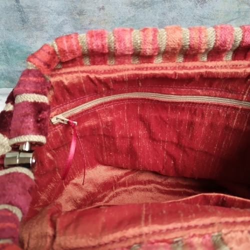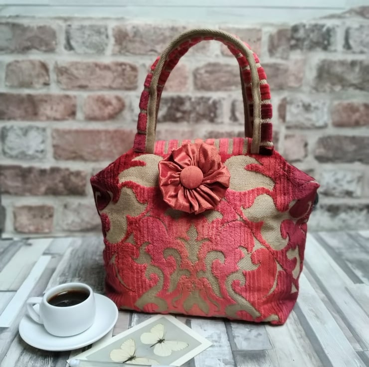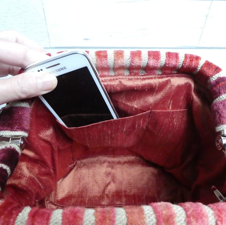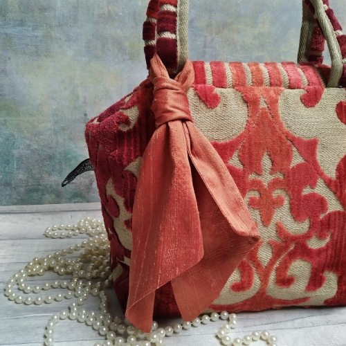 Absolutely perfect for a special occasion, this is a luxurious bag made from rich dark red toned chenille tapestry upholstery fabric and is lined with a complementary rich red-russet shot silk lining. It opens to a width of 13cm x 18cm by means of a metal, hinged frame - Mary Poppins style!