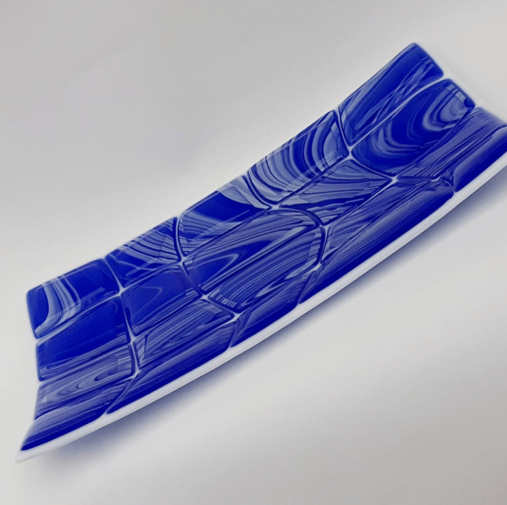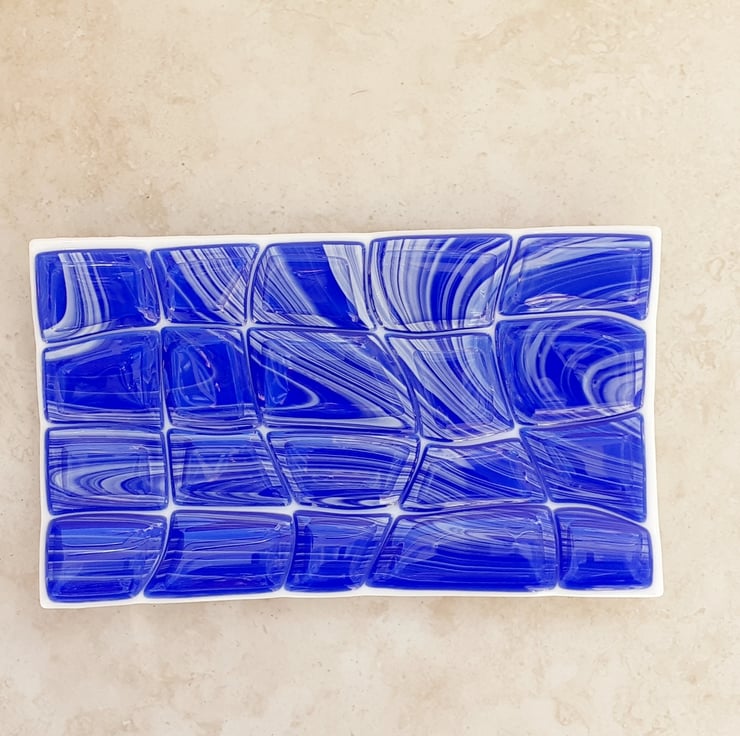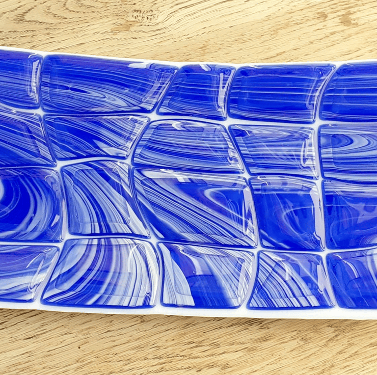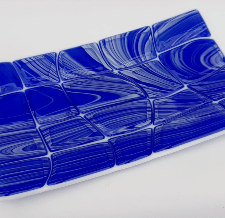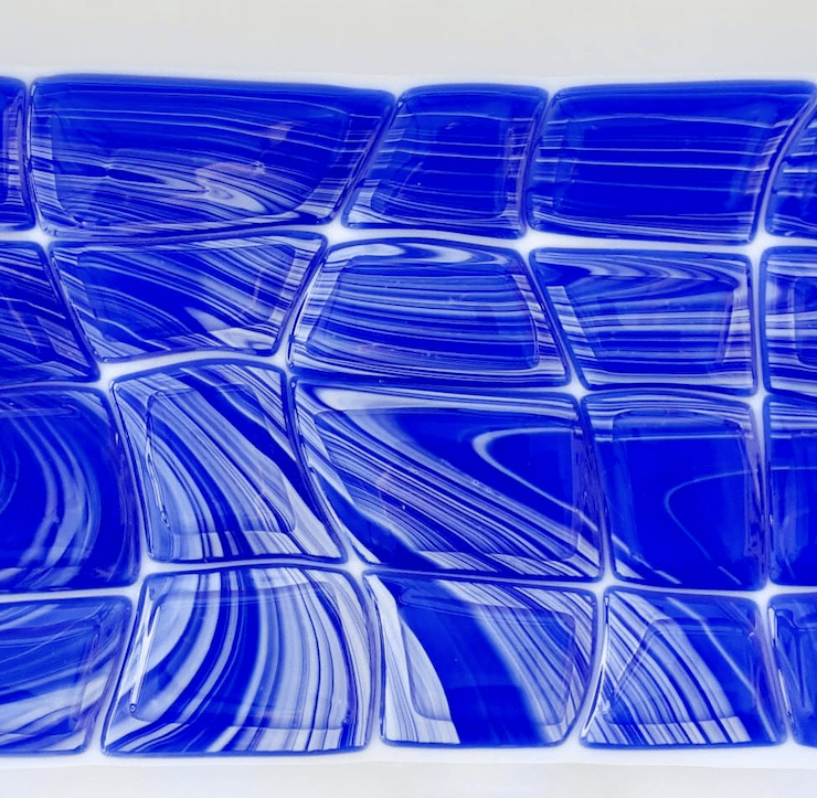 A white piece of base glass has been topped with segments cut from one piece of swirling vivid electric blue and white art glass. Smaller sections of cleared glass have then been stacked on top of the coloured glass.