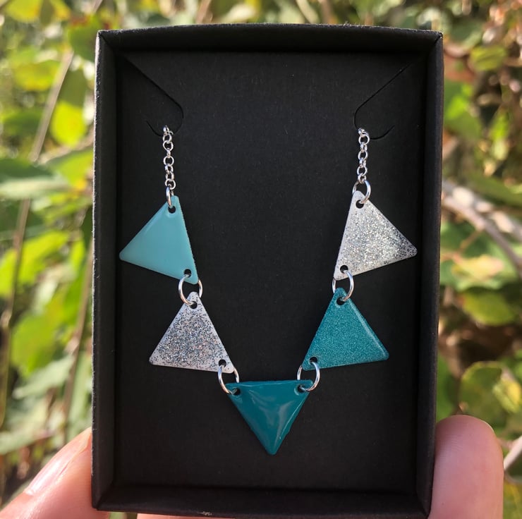 14.5x14.5mm stainless steel triangle charms have been hand enamelled in three shades of turquoise and hung with two white and silver glitter triangular charms. Joined together using sterling silver jump rings and attached to a sterling silver belcher chain.