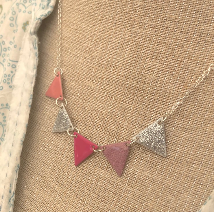 Dare to be bold with this pink and silver glitter bunting necklace.