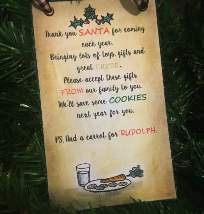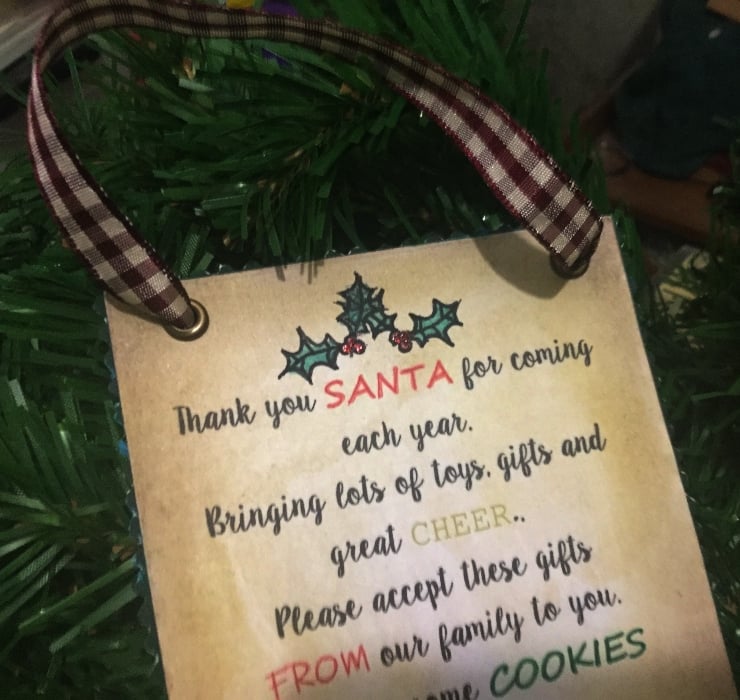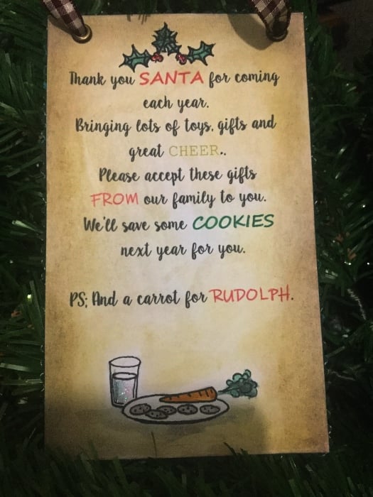 A handmade table or hanging decoration (you can choose with or without string) welcoming Santa to your home and thanking him.