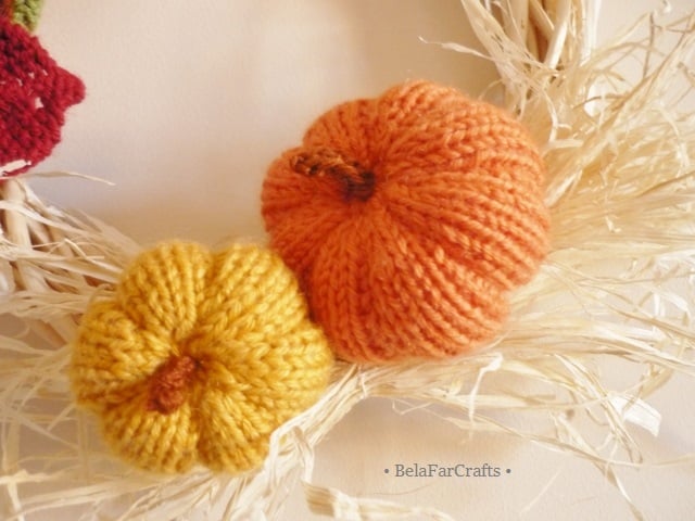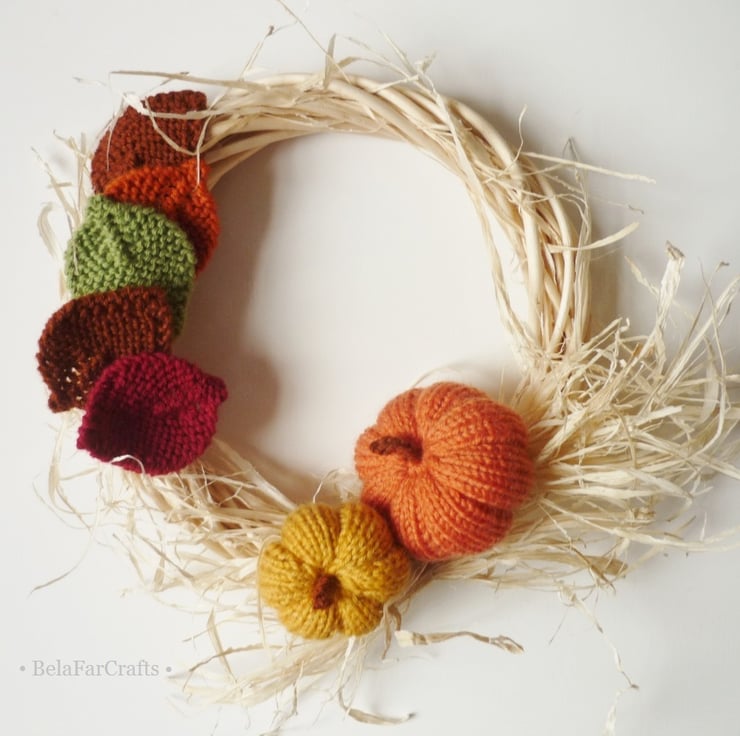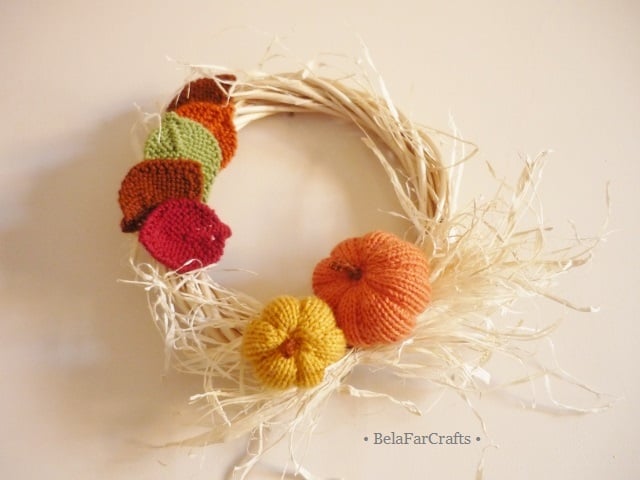 I used a wood wreath, raffia and my hand knitted decorations in traditional fall colours.