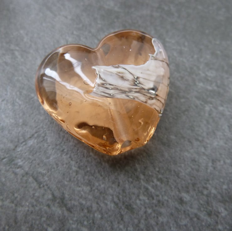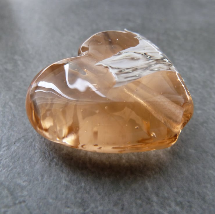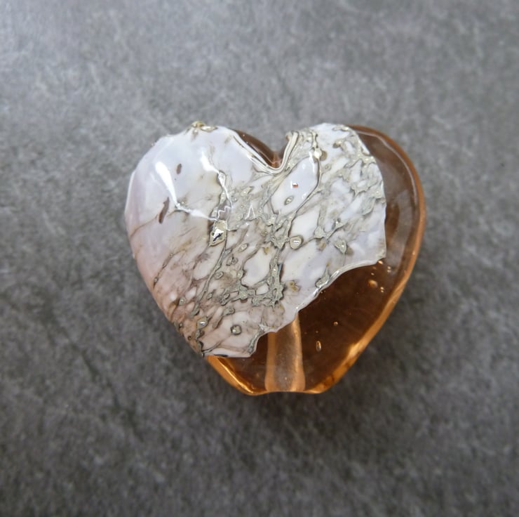 A lampwork glass heart focal bead made with peach/pink glass and wrapped with silvered ivory shards. It has been shaped using a brass press.