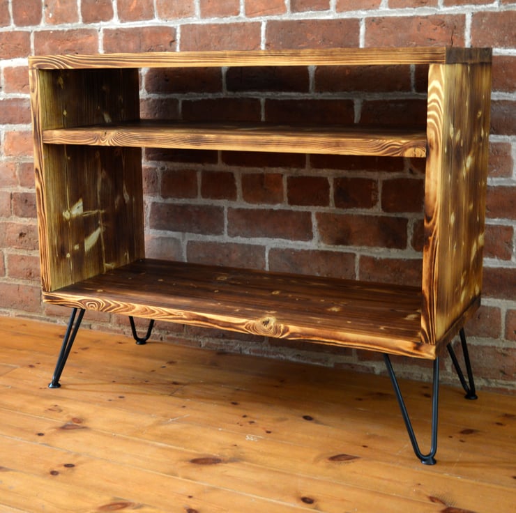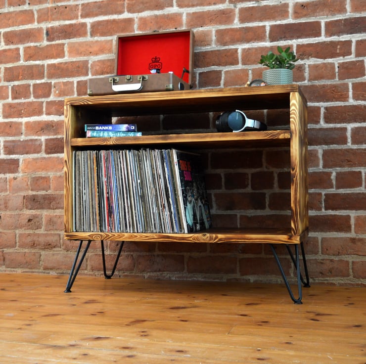 Our industrial vinyl units are hand made in Wales from solid Pine. We use our signature charring technique and a wax oil finishes for beautiful strength and durability. We have designed this unit with 2 shelves - one for storing vinyl and another for holding your amplifier or other associated items.