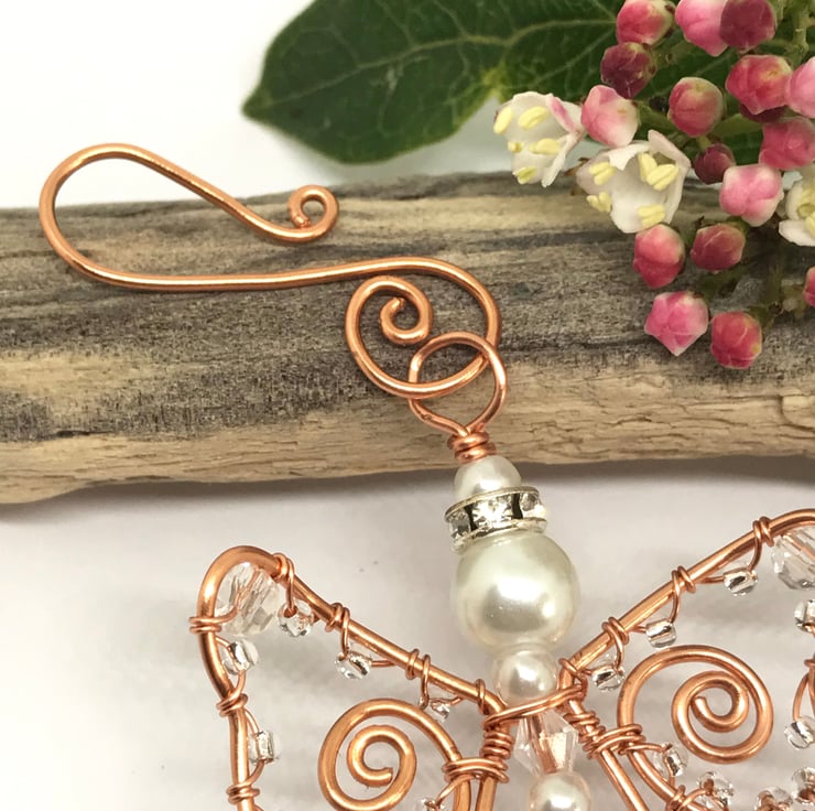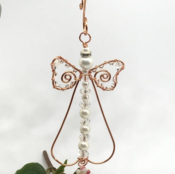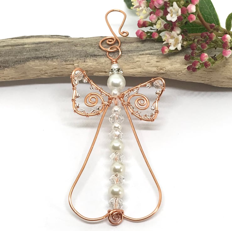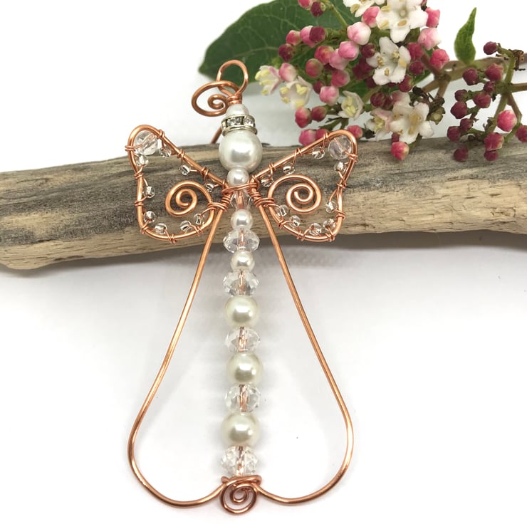 A pretty Angel decoration handcrafted in copper wire with pearls and crystals.