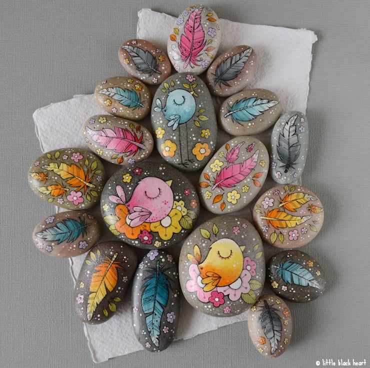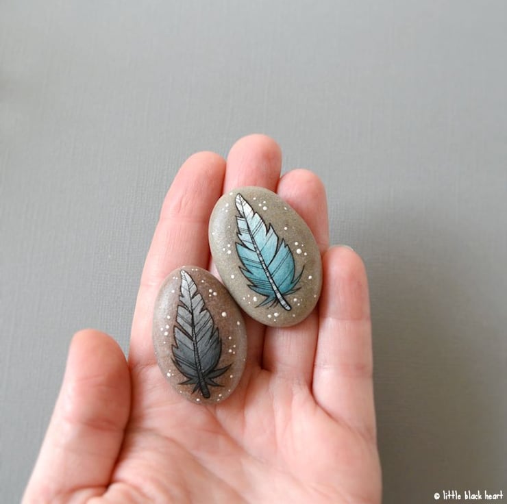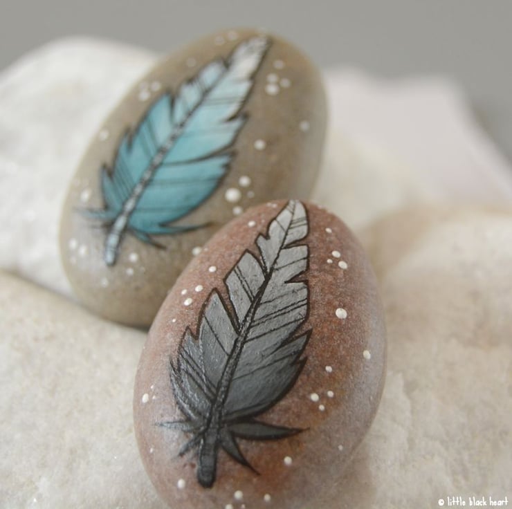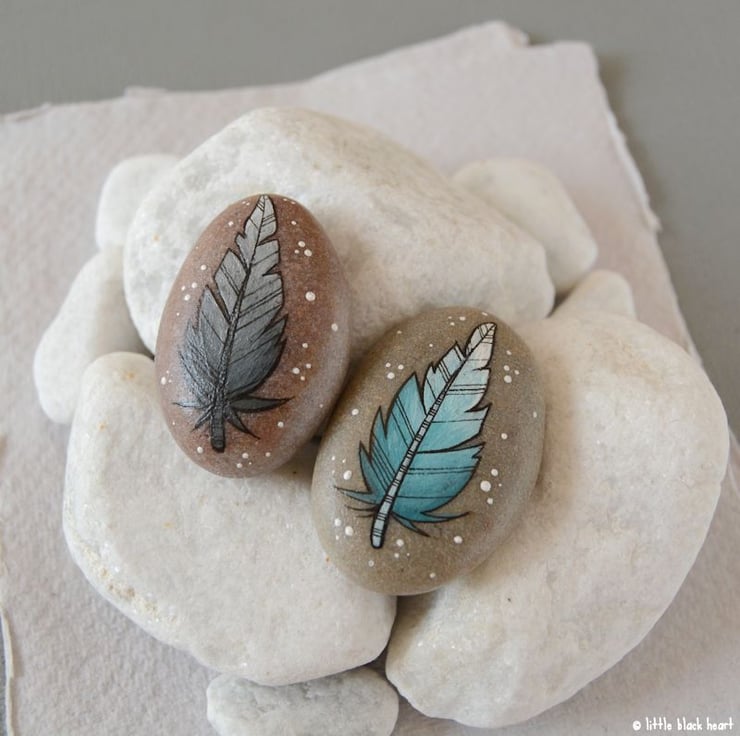 hand painted and inked, on smooth round pebbles.