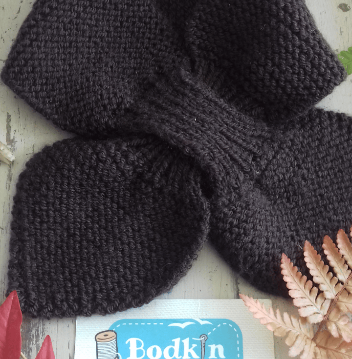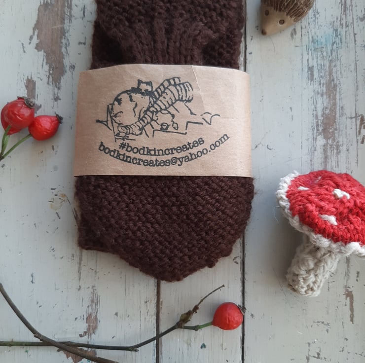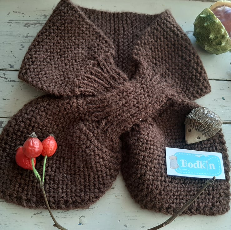 In dark brown ,handknitted bowscarf for a warm neck this autumn. Embrace your inner miss Marple. Wool and acrylic mix for durability. Comes wrapped in tissue and boxed .