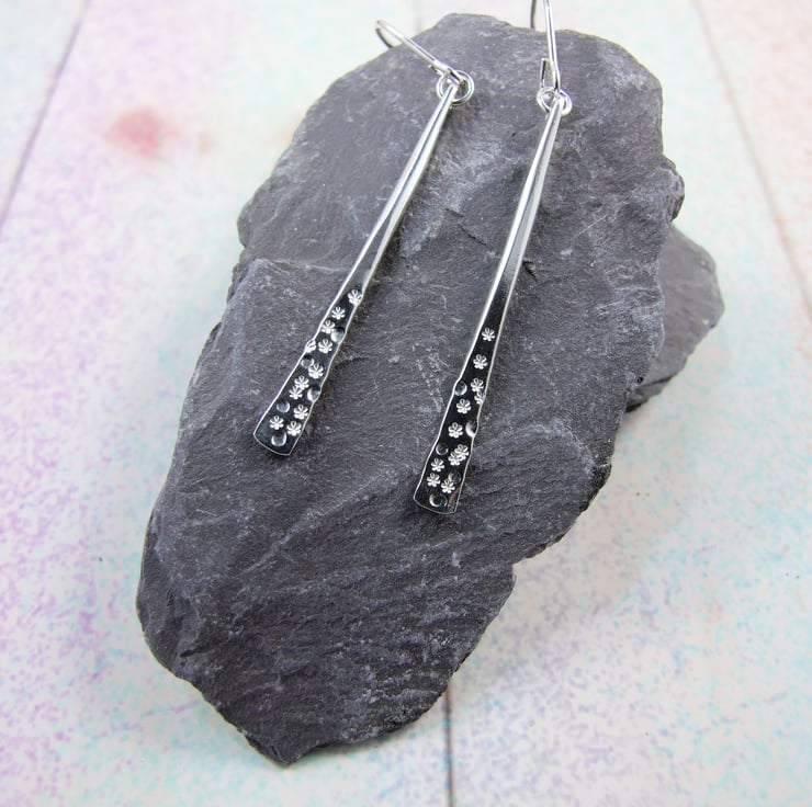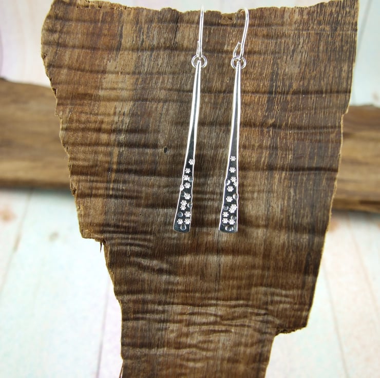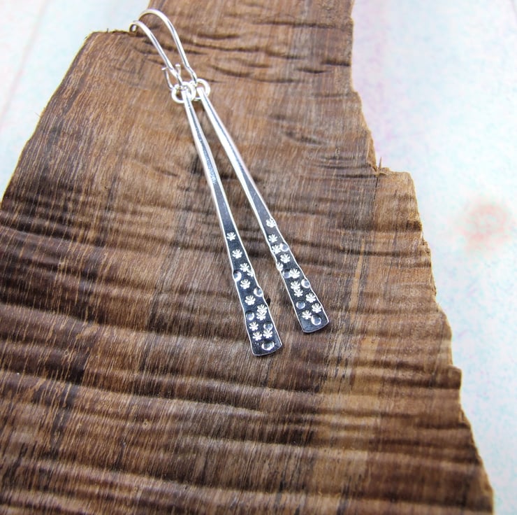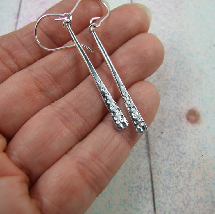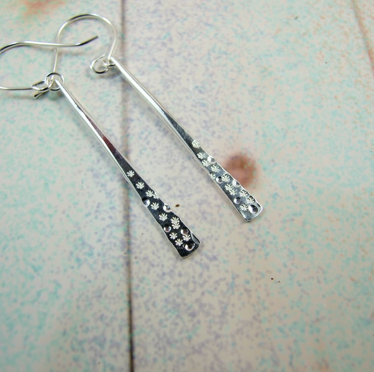 Hand Forged Hammered Silver Bar Dropper Earrings hand stamped with little spots and stars