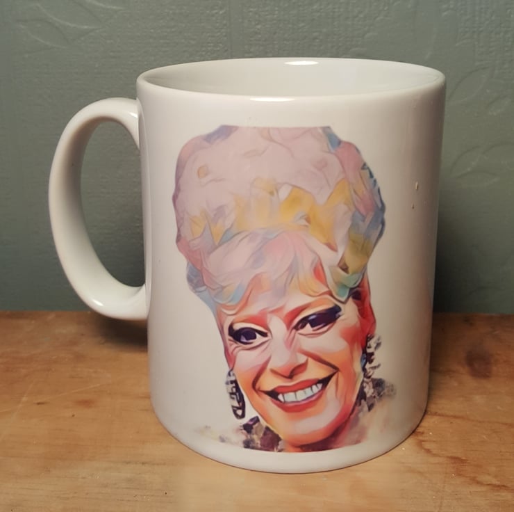A lovely ceramic mug/cup featuring Bet Lynch/Gilroy (Julie Goodyear) from an original digital painting by Jayne Tunnicliffe.
