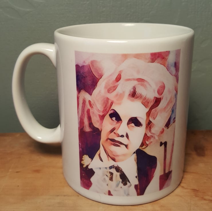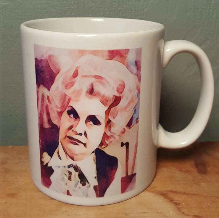 A lovely ceramic mug/cup featuring Mollie Sugden as Mrs Slocombe in Are You Being Served, from an original digital painting by Jayne Tunnicliffe.