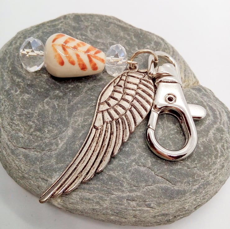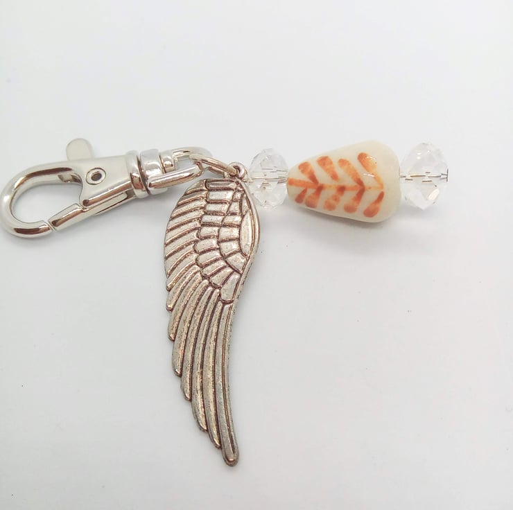 Cream Beaded Bag Charm with a Crystal and An Angel Wing Charm, Birthday Gift, Teachers Gift , Ladies Accessories Secret Santa Gift, Stocking Filler, Christmas Gift