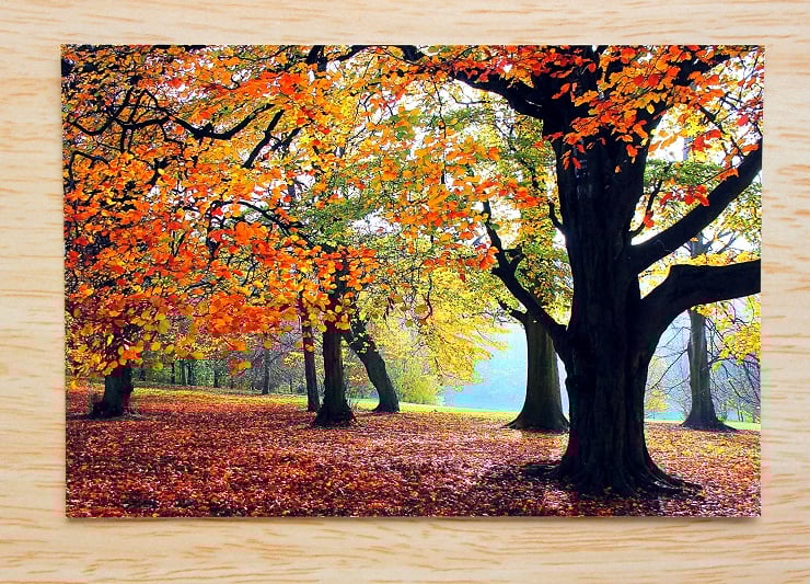 This pack contains four duplicate postcards with a picture of Autumn Woodland Trees.