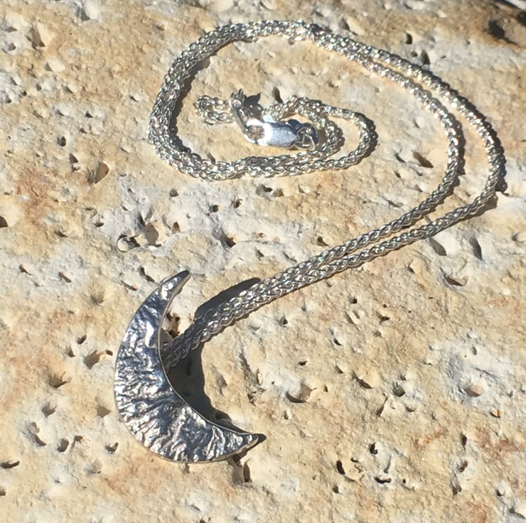 Owing to the reticulation process each moon is completely different and the surface of the pendant you receive will be a variation of the one in the photograph. If you have any questions please feel free to contact me.