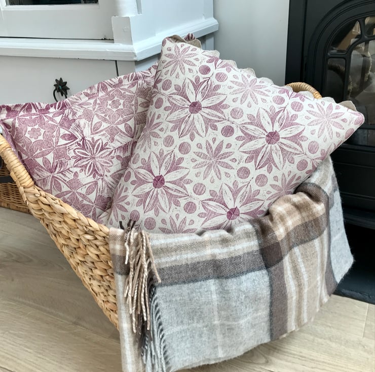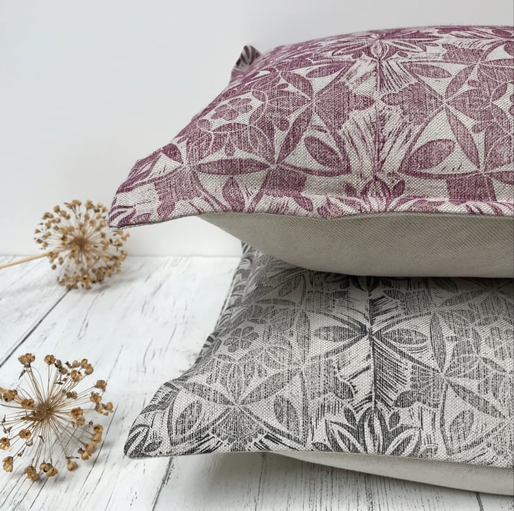 This unique design is block printed by hand using Eco-Friendly inks on to natural linen union fabric woven in Scotland. Finished with a stitched border, the reverse of the cushion is plain linen union fabric with an envelope enclosure